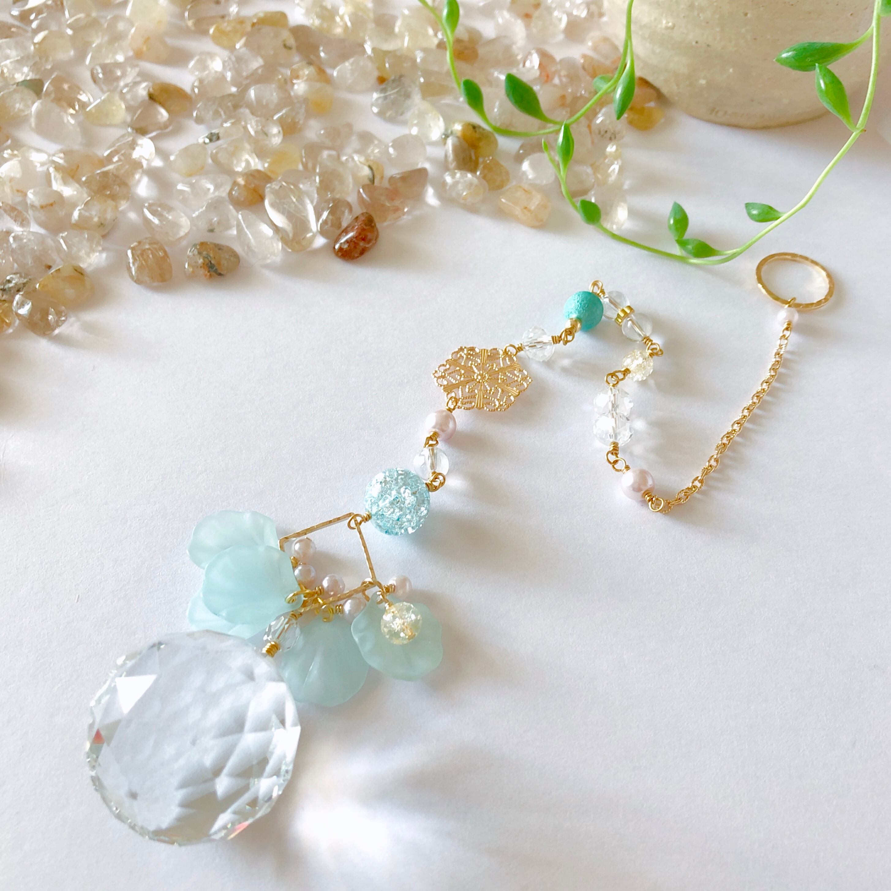 ブルースターのように水色の花びらきらめくクリスタルのサンキャッチャー。