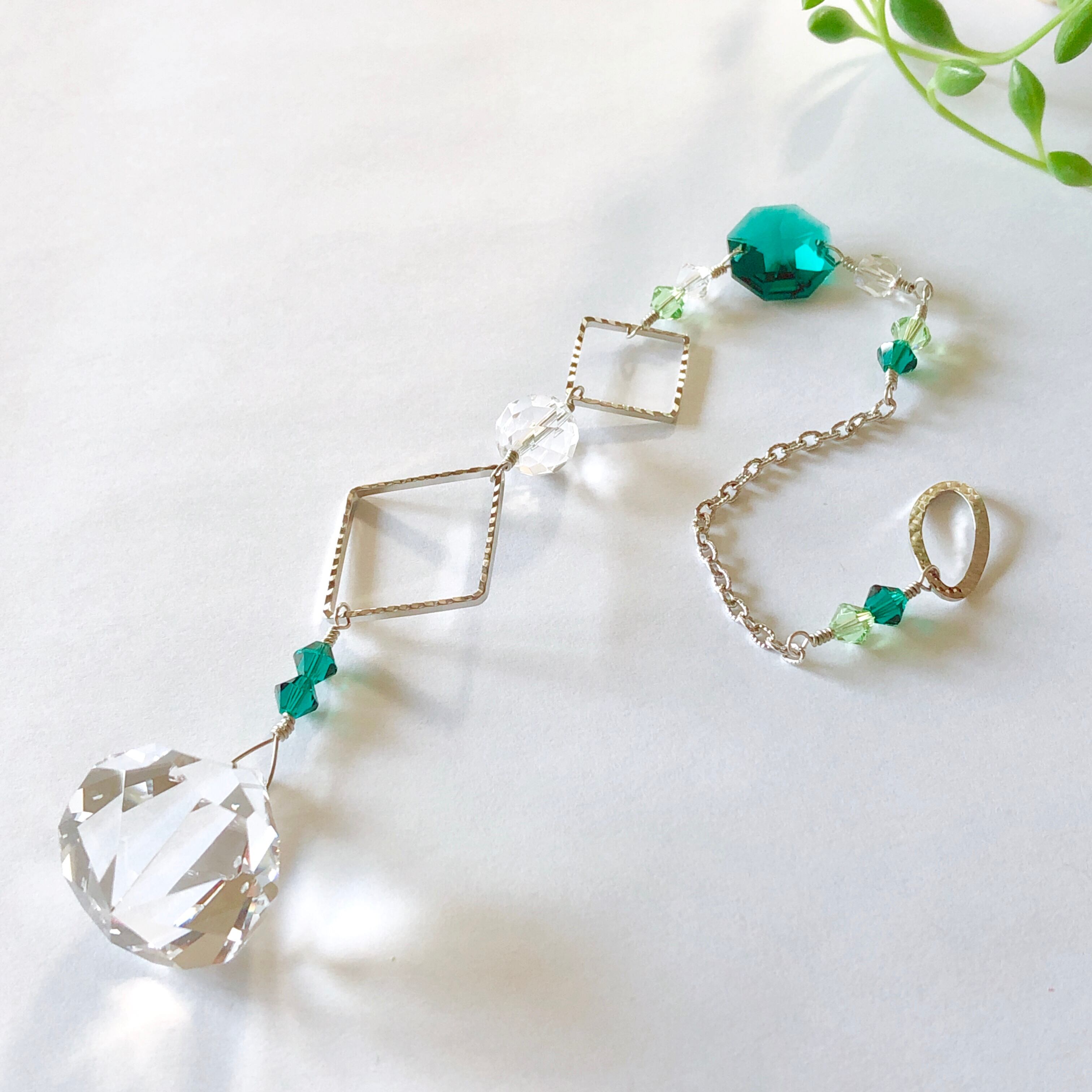シンプルで美しいスワロフスキークリスタルガラスエメラルドとベルトップ3cmのサンキャッチャーです。