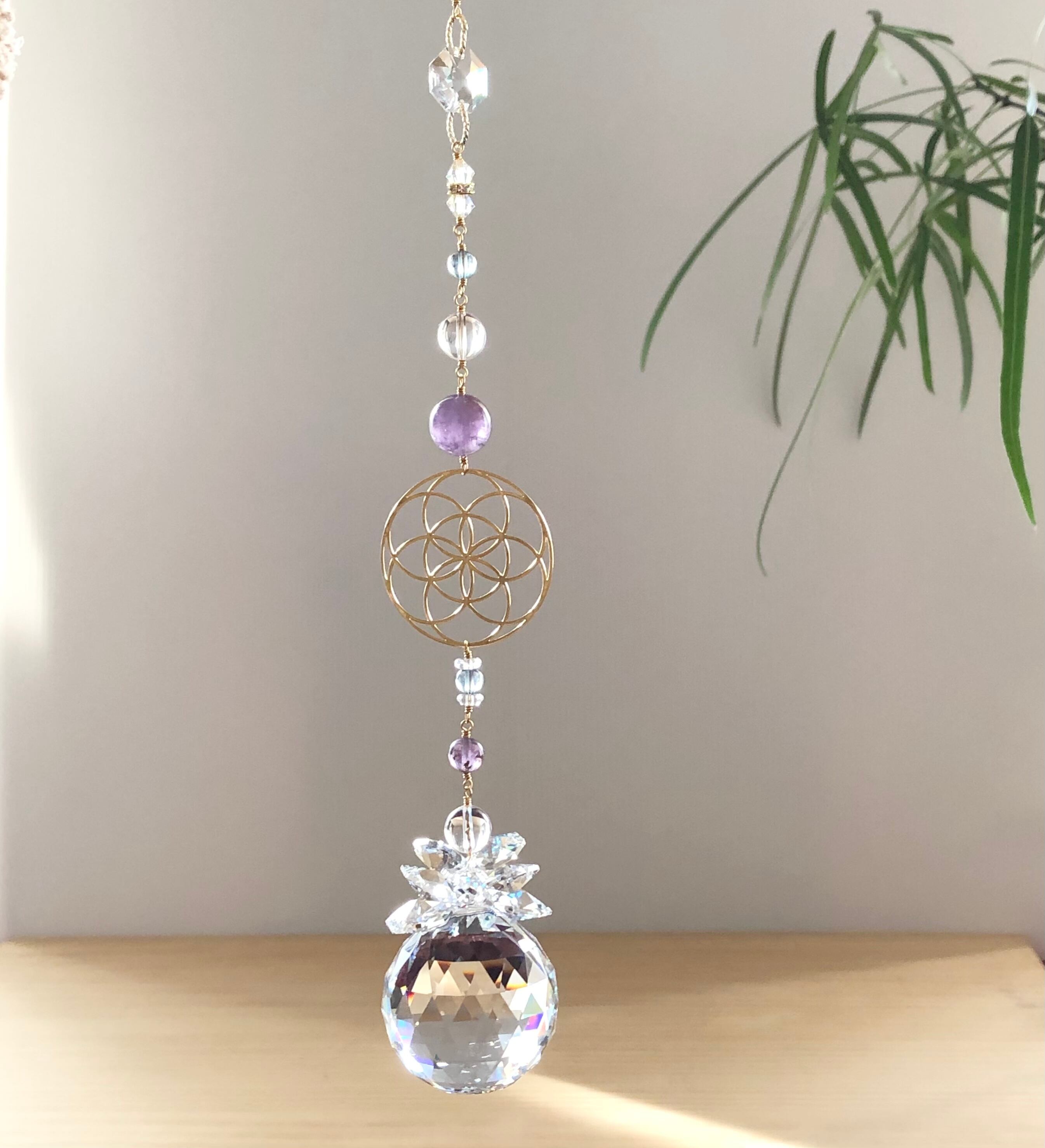 sold out最高の癒しと浄化を♡天然石とシードオブライフとスワロフスキークリスタルのサンキャッチャー
