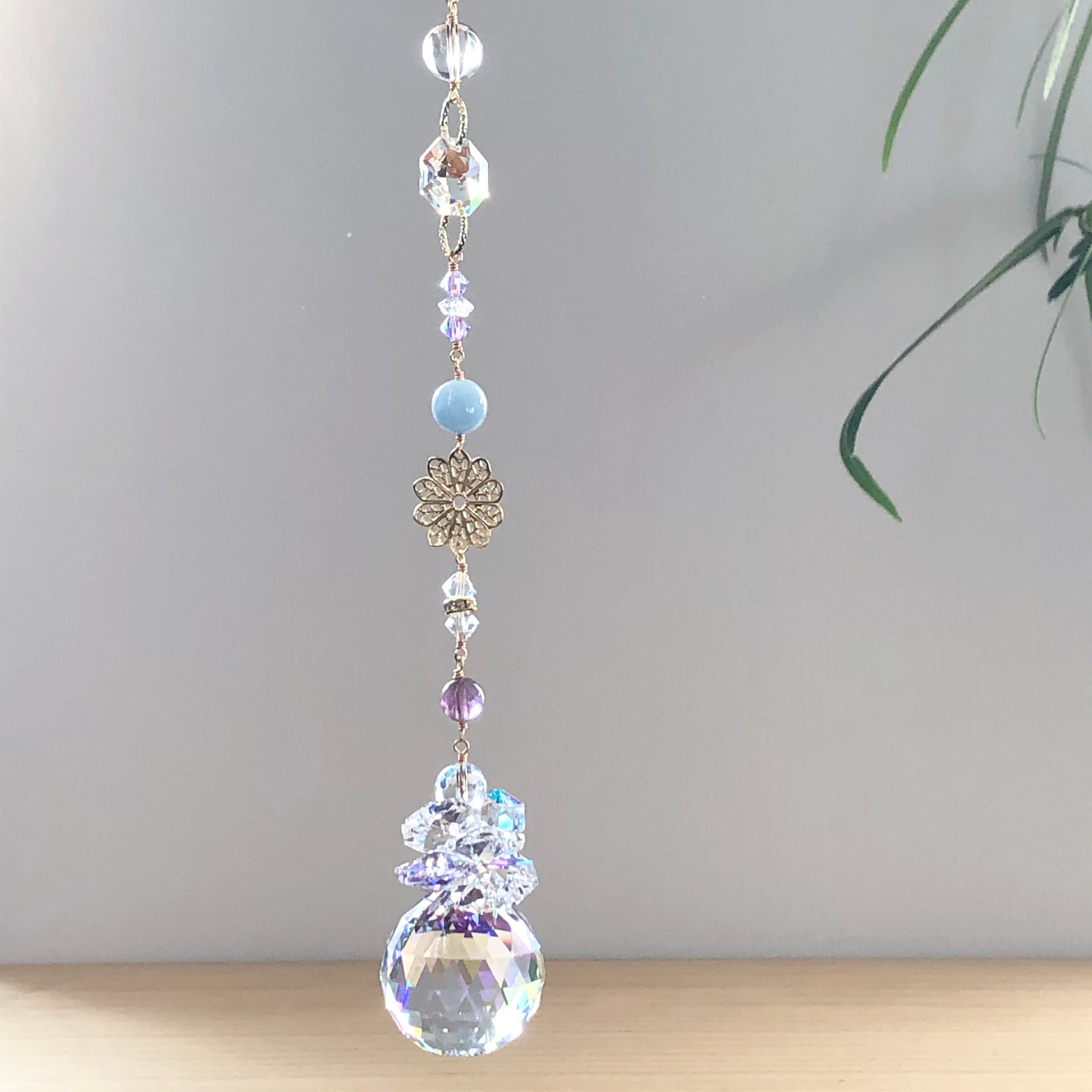 癒されて幸せ花開く♡アクアマリン・カコクセナイトインアメジストとお花とスワロフスキークリスタルガラスブルーAB3cmのサンキャッチャーです。