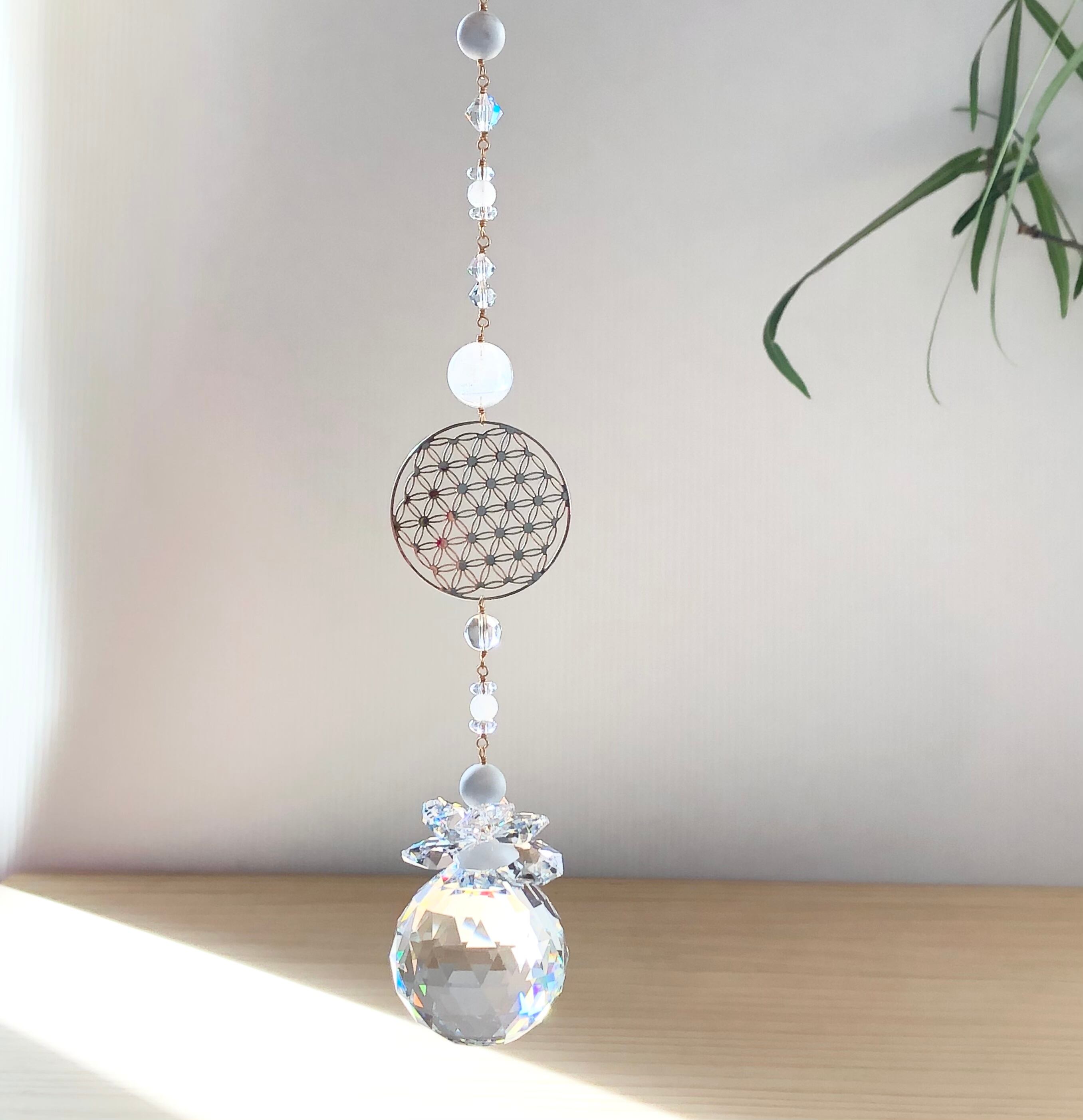 神聖幾何学模様フラワーオブライフとホワイトレースファントムクォーツ・ムーンストーン・ハウライト・スワロフスキークリスタルガラス4cmを繋いだとてもパワフルなサンキャッチャーです。
