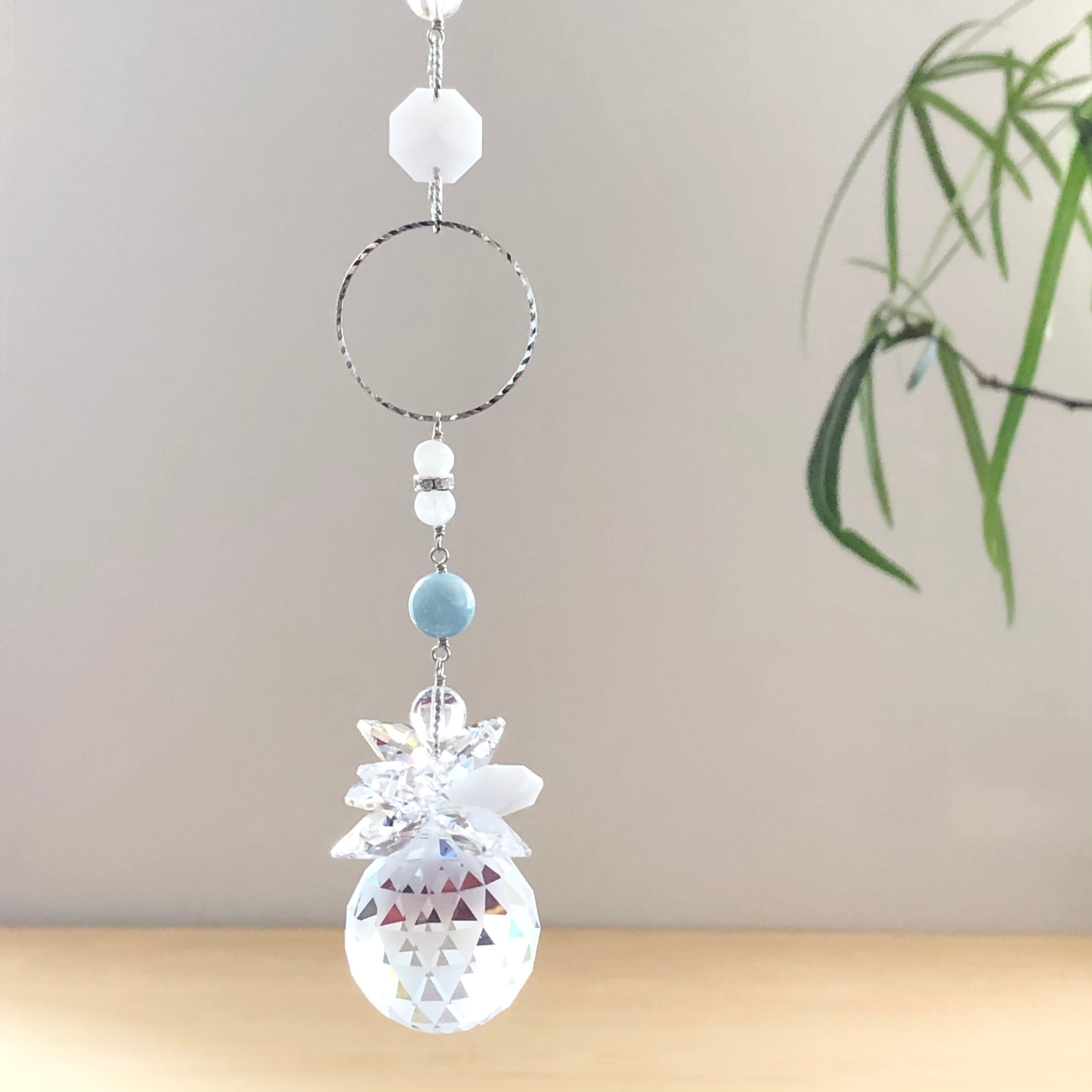 愛と癒しを♡天使のアクアマリン&ムーンストーンとスワロフスキークリスタルガラスフロスト3cmを繋いだサンキャッチャーです。