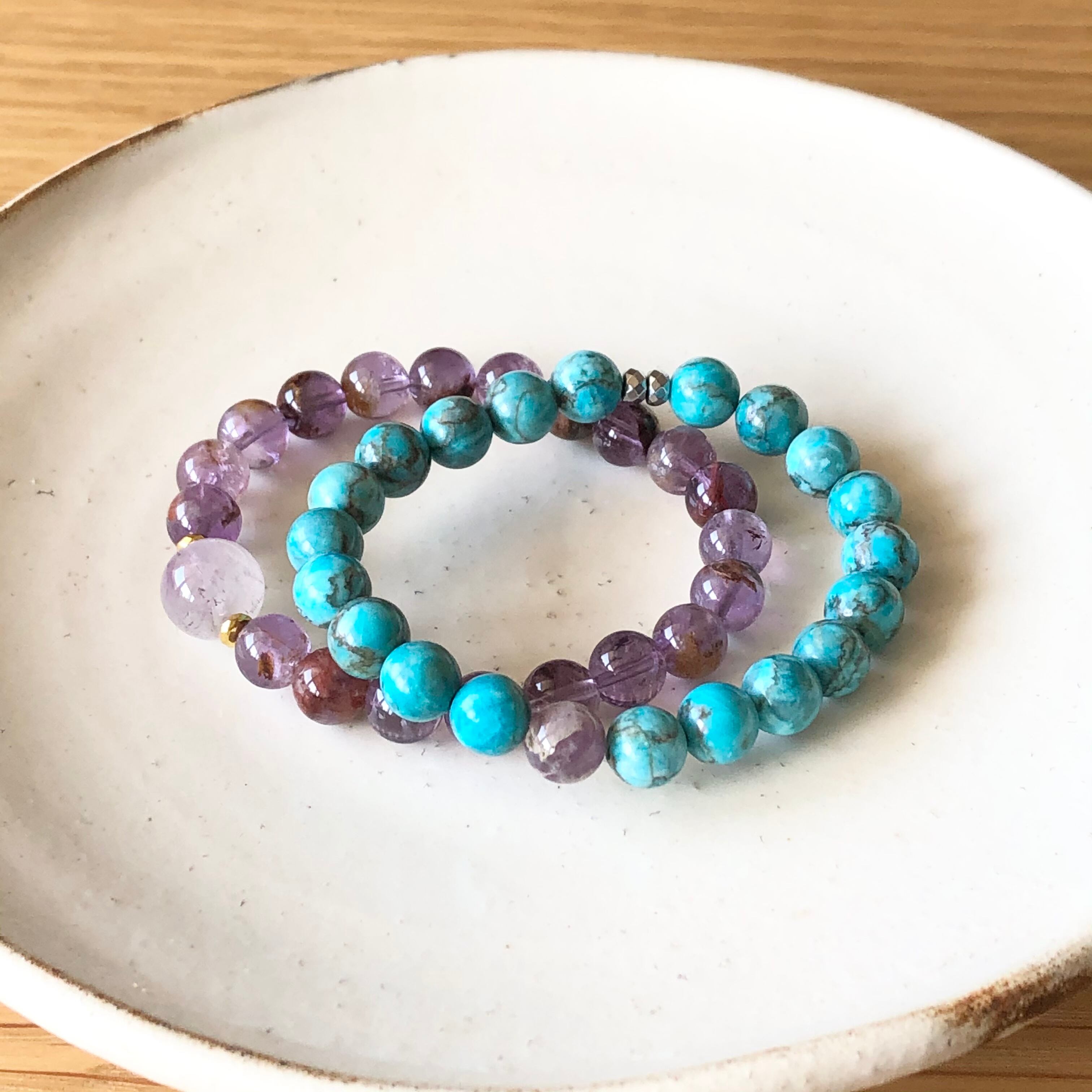 爽やかなブルーが印象的なターコイズ・カコクセナイトインアメジスト・ヘマタイトのブレスレットです。