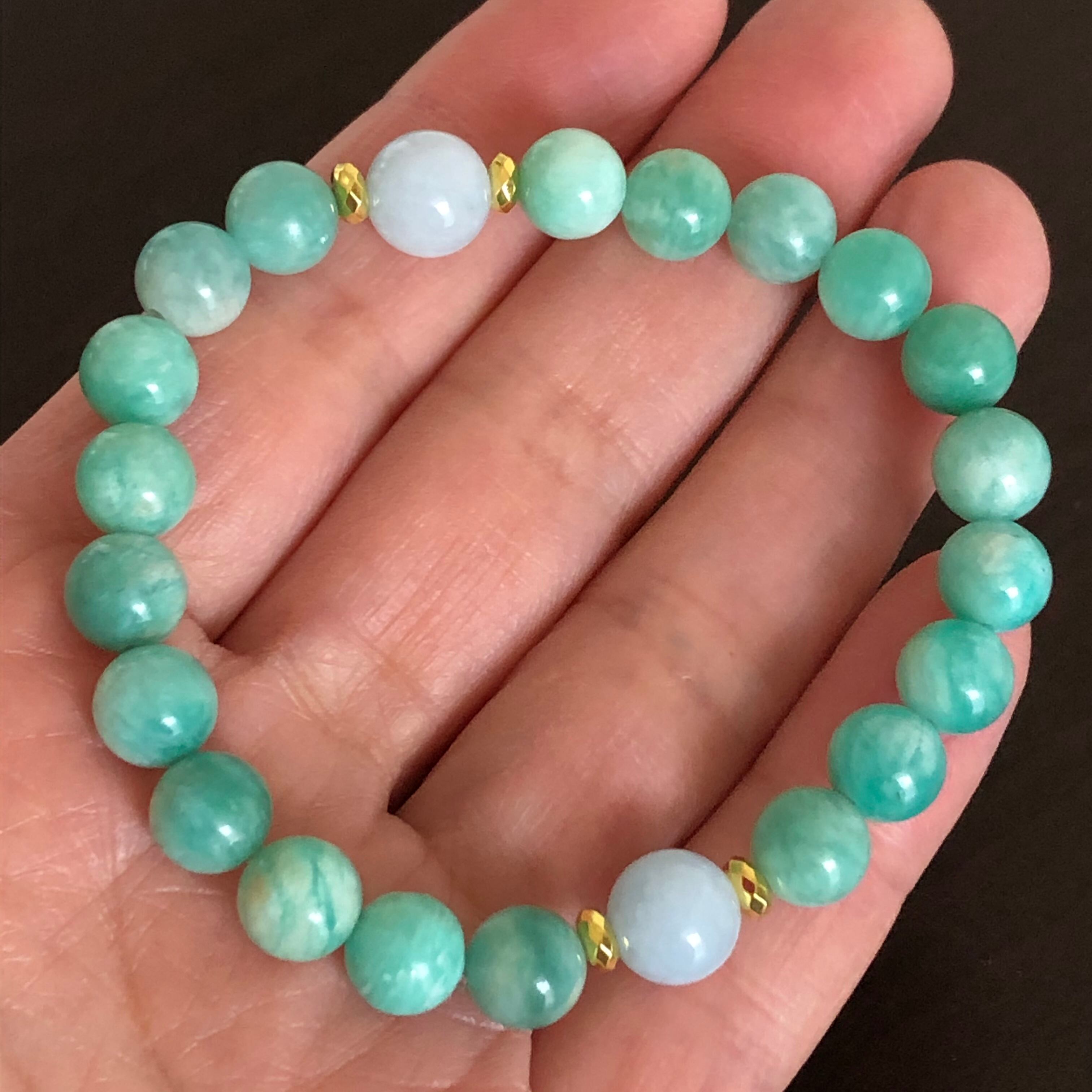 希望と幸運をもたらす♡ライトグリーンのアマゾナイトとアクアマリンとヘマタイトのブレスレットです。