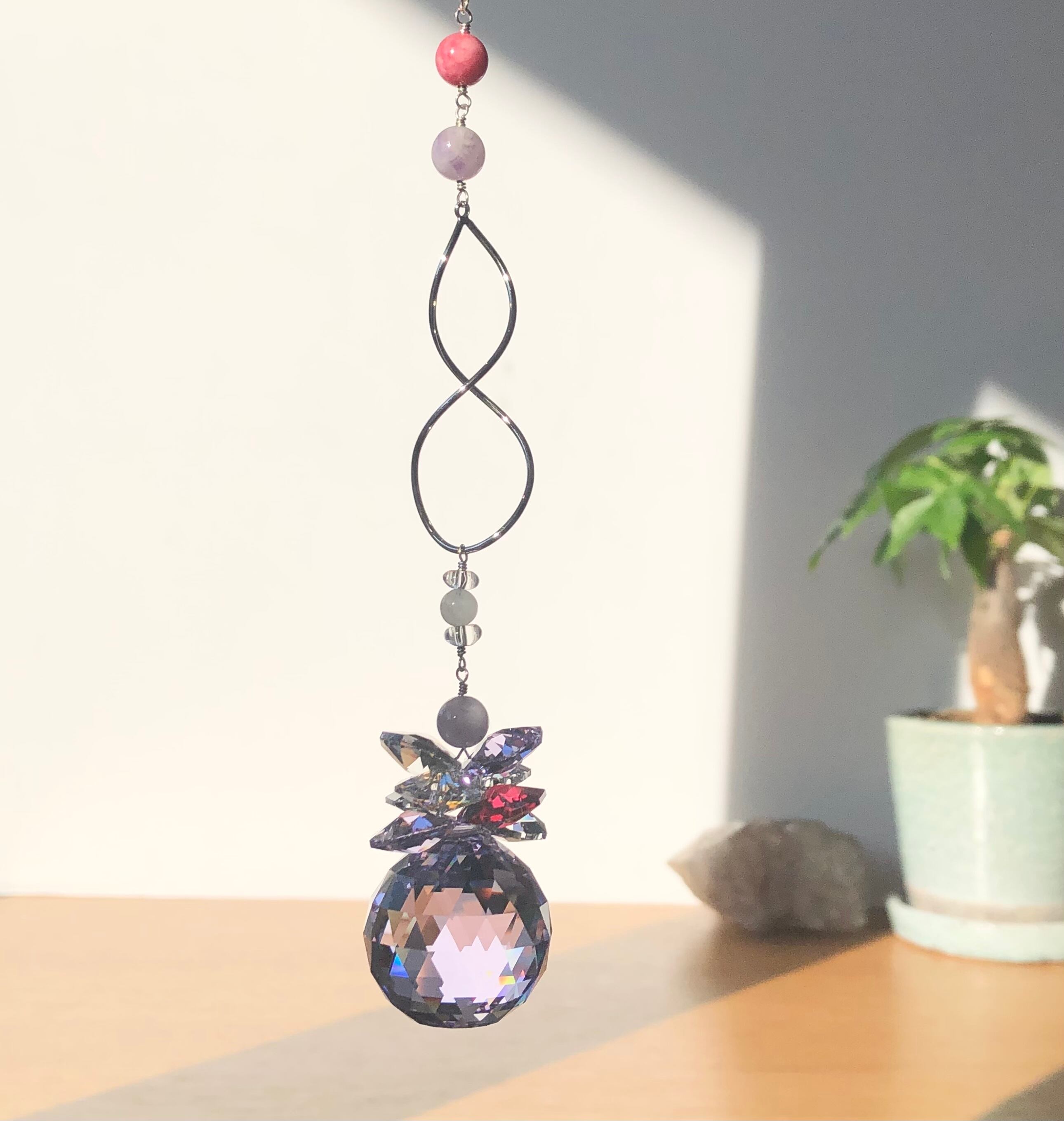ラベンダーアメジスト・ローズレッドクォーツ・ムーンストーン・水晶とツイストループとスワロフスキークリスタルガラスバイオレット3cmを繋いだサンキャッチャーです。