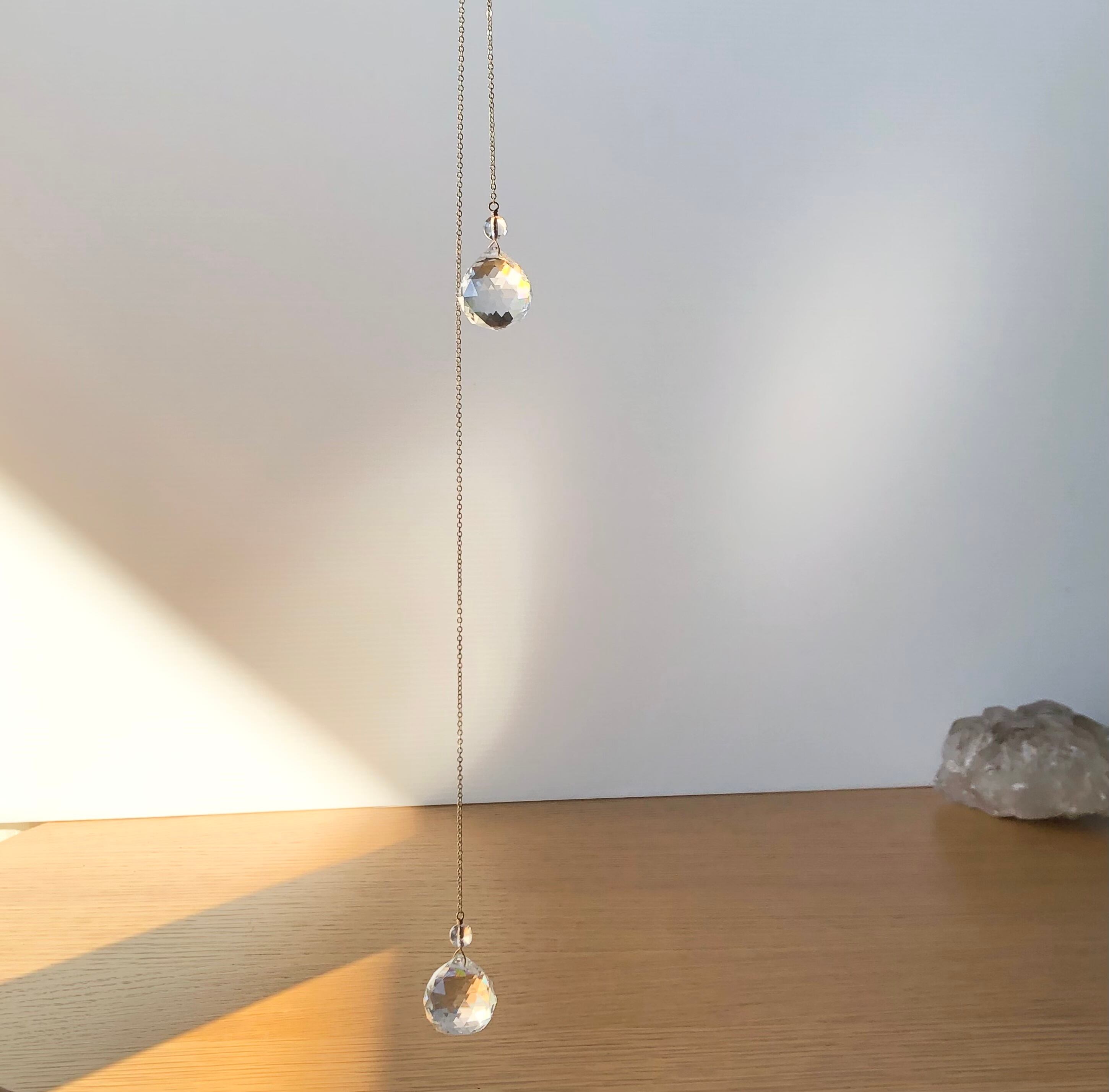 クリスタルガラス2cmと水晶をゴールドのチェーンで繋いだシンプルなサンキャッチャーです。