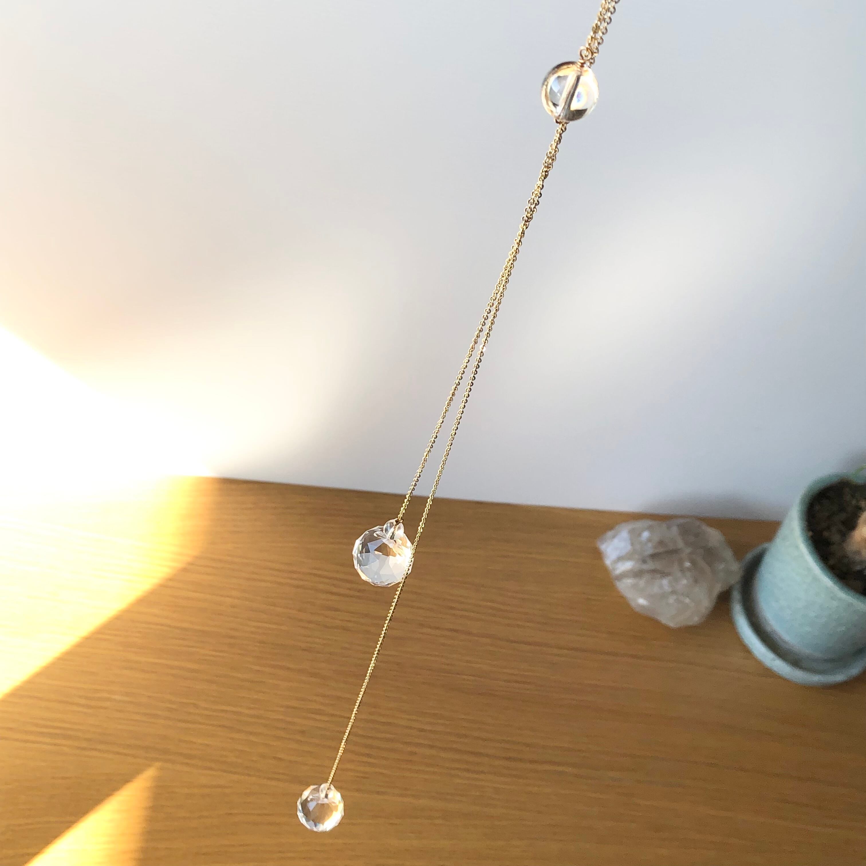 クリスタルガラス2cmと水晶をゴールドのチェーンで繋いだ40cmのシンプルなサンキャッチャーです。