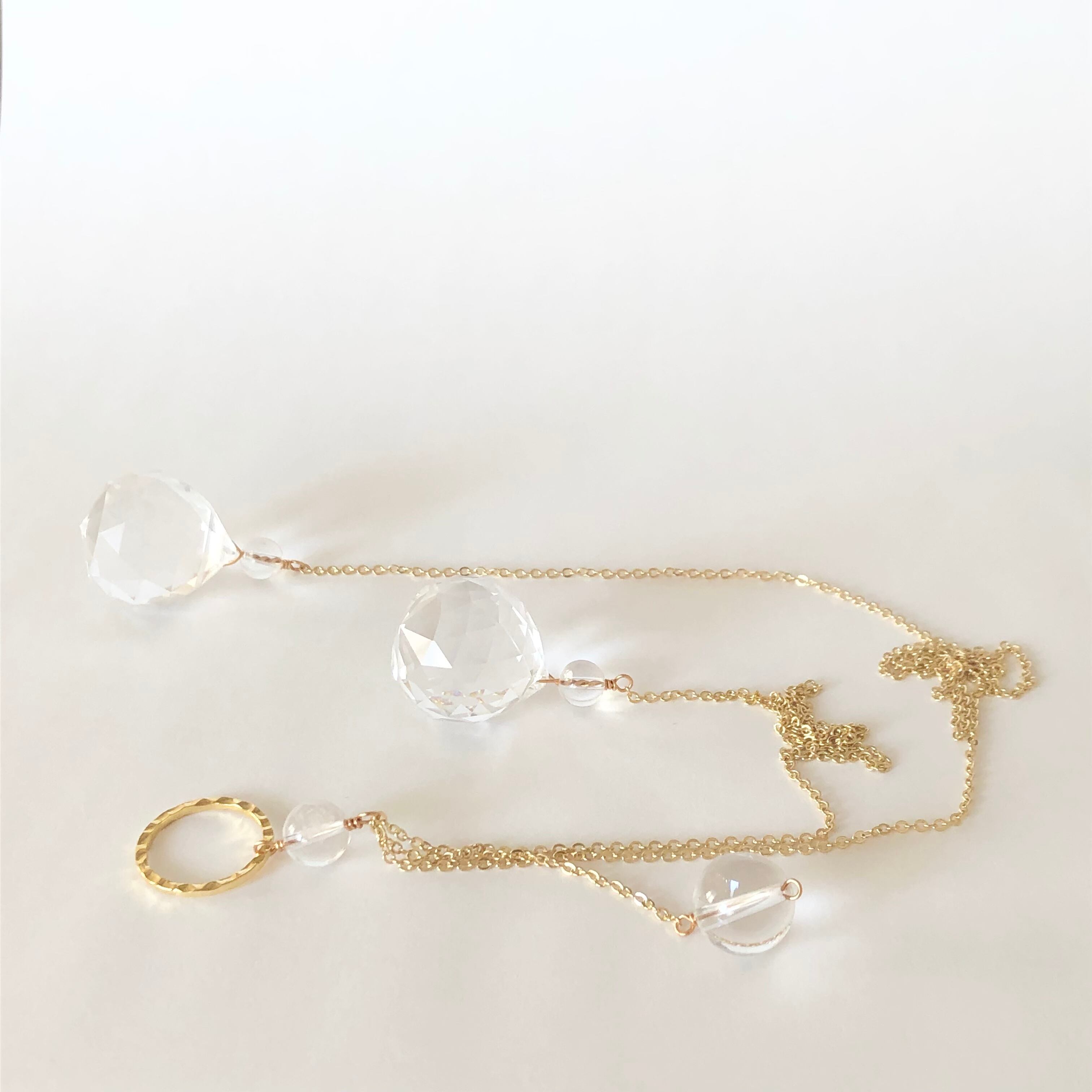 クリスタルガラス2cmと水晶をゴールドのチェーンで繋いだシンプルなサンキャッチャーです。