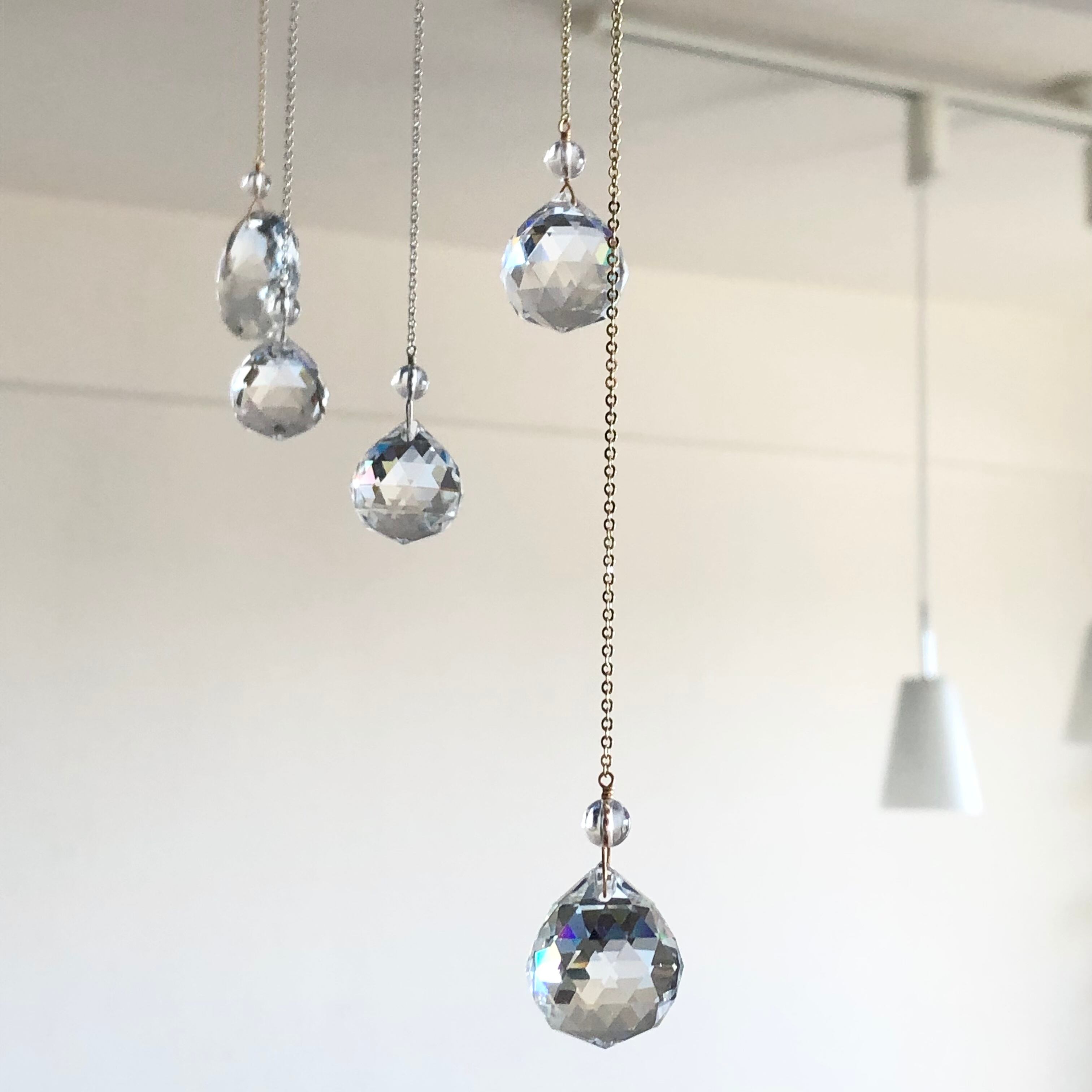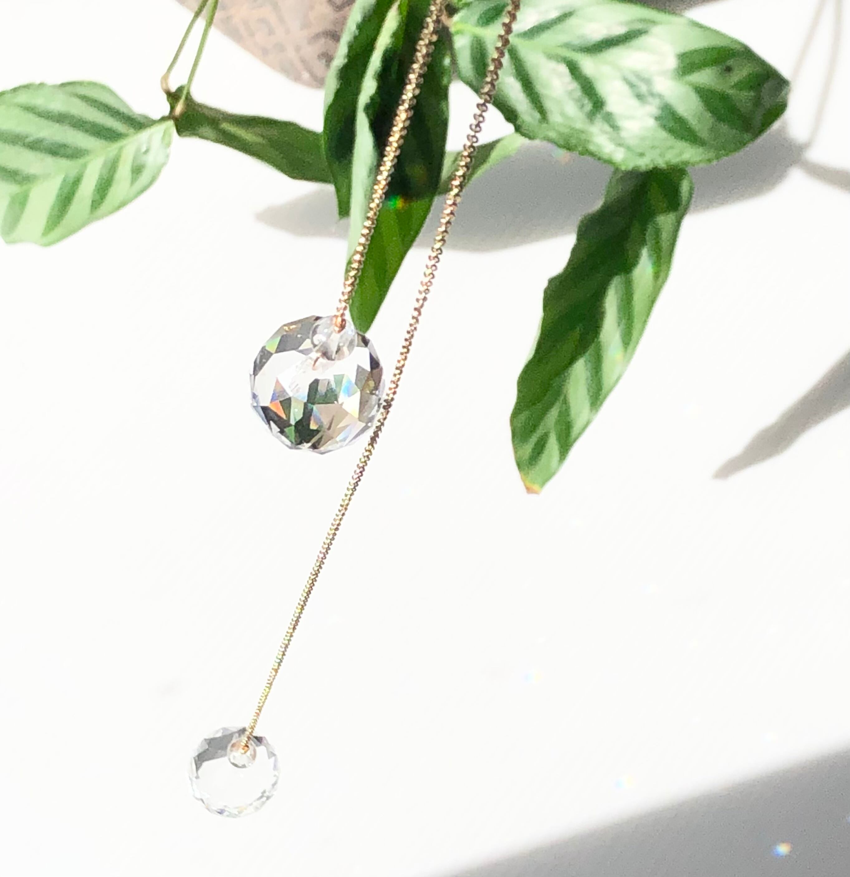 クリスタルガラス2cmと水晶をゴールドカラーのチェーンで繋いだシンプルな60cmのサンキャッチャーです。