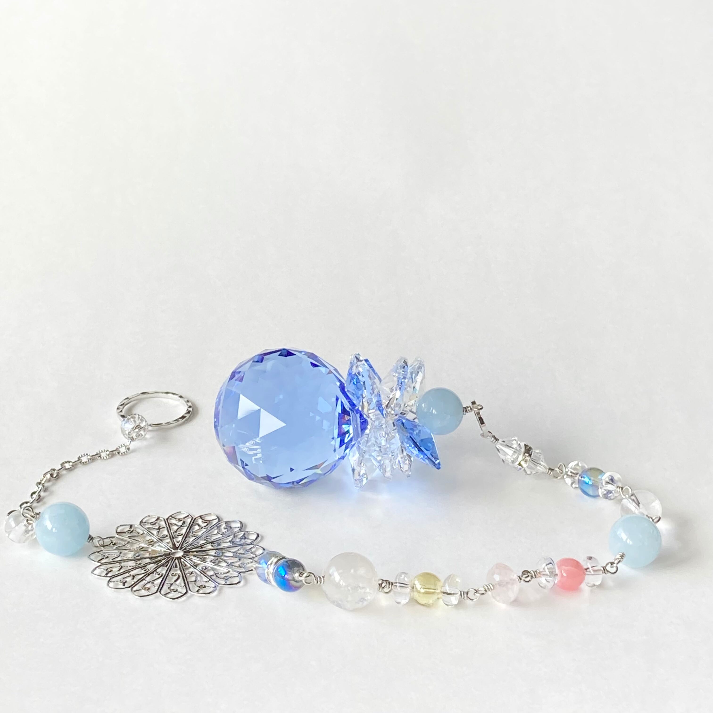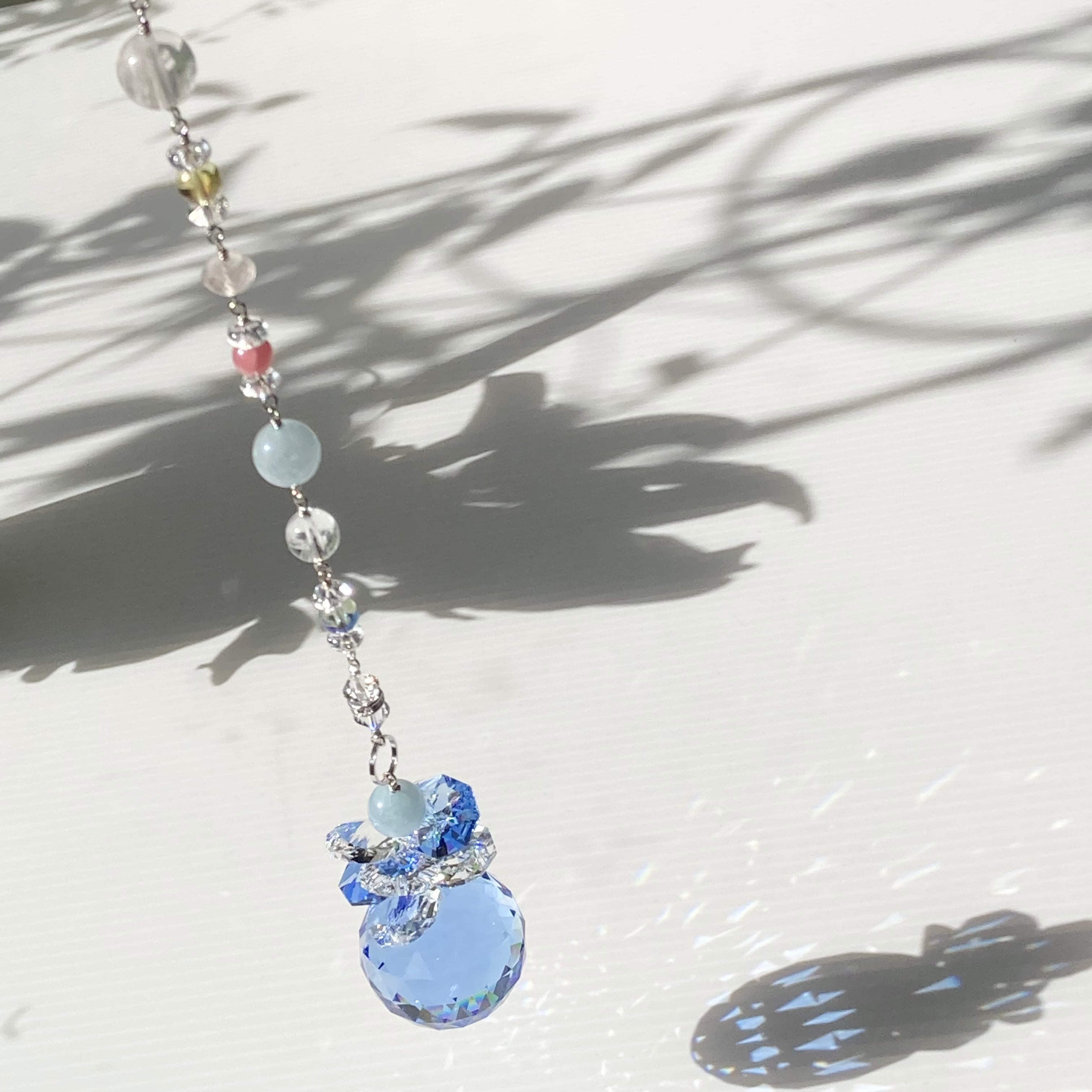 幸せ度アップ♡アクアマリンとインカローズとスワロフスキークリスタルガラスミディアムサファイア3cmのサンキャッチャーです。