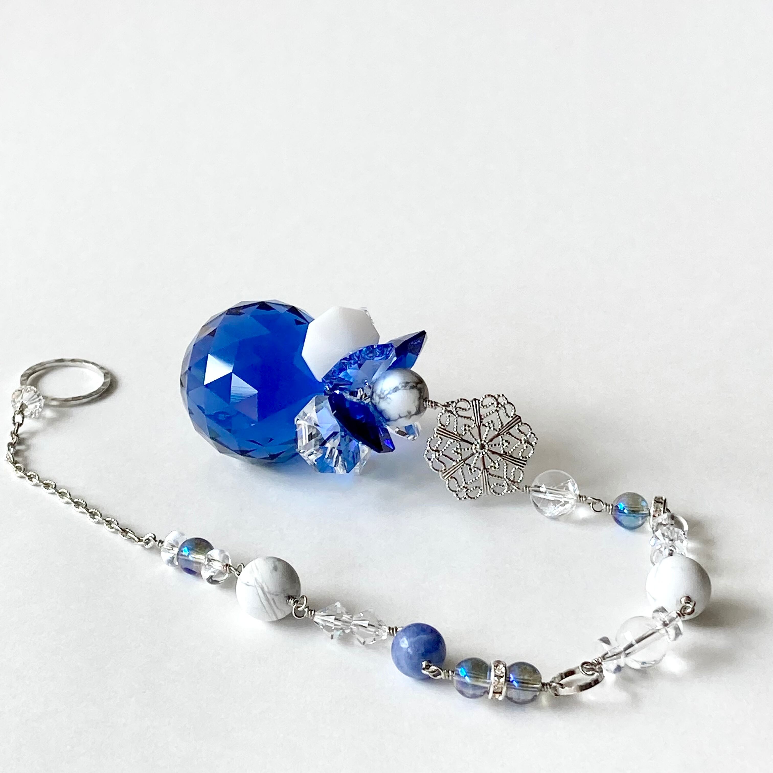 深い青のスワロフスキークリスタルガラスダークサファイアは美しく輝くサンキャッチャーとなりました。
