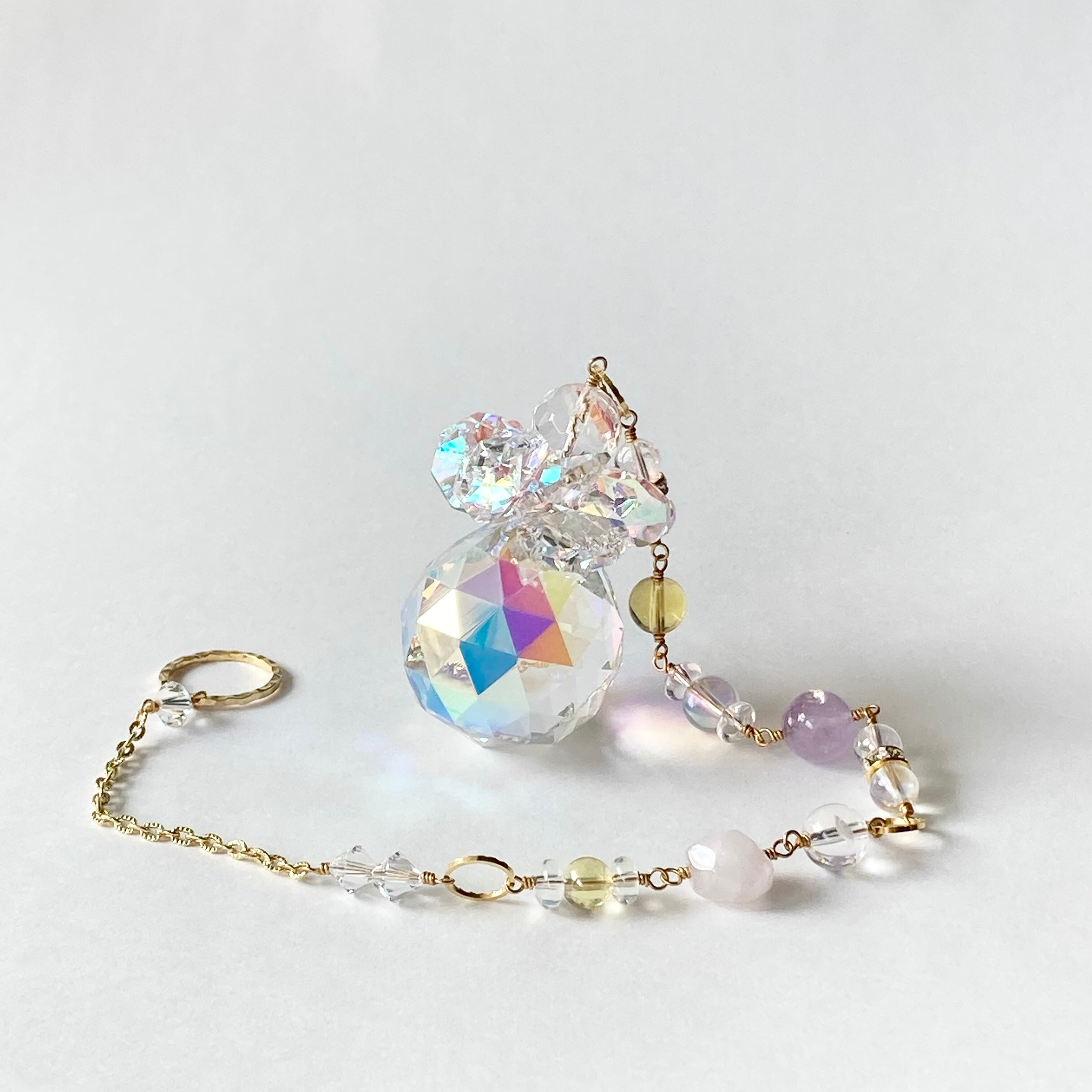 幸せと豊かさを引き寄せるローズクォーツ・アメジスト・シトリン・水晶・オーラクォーツを繋いだサンキャッチャーです。