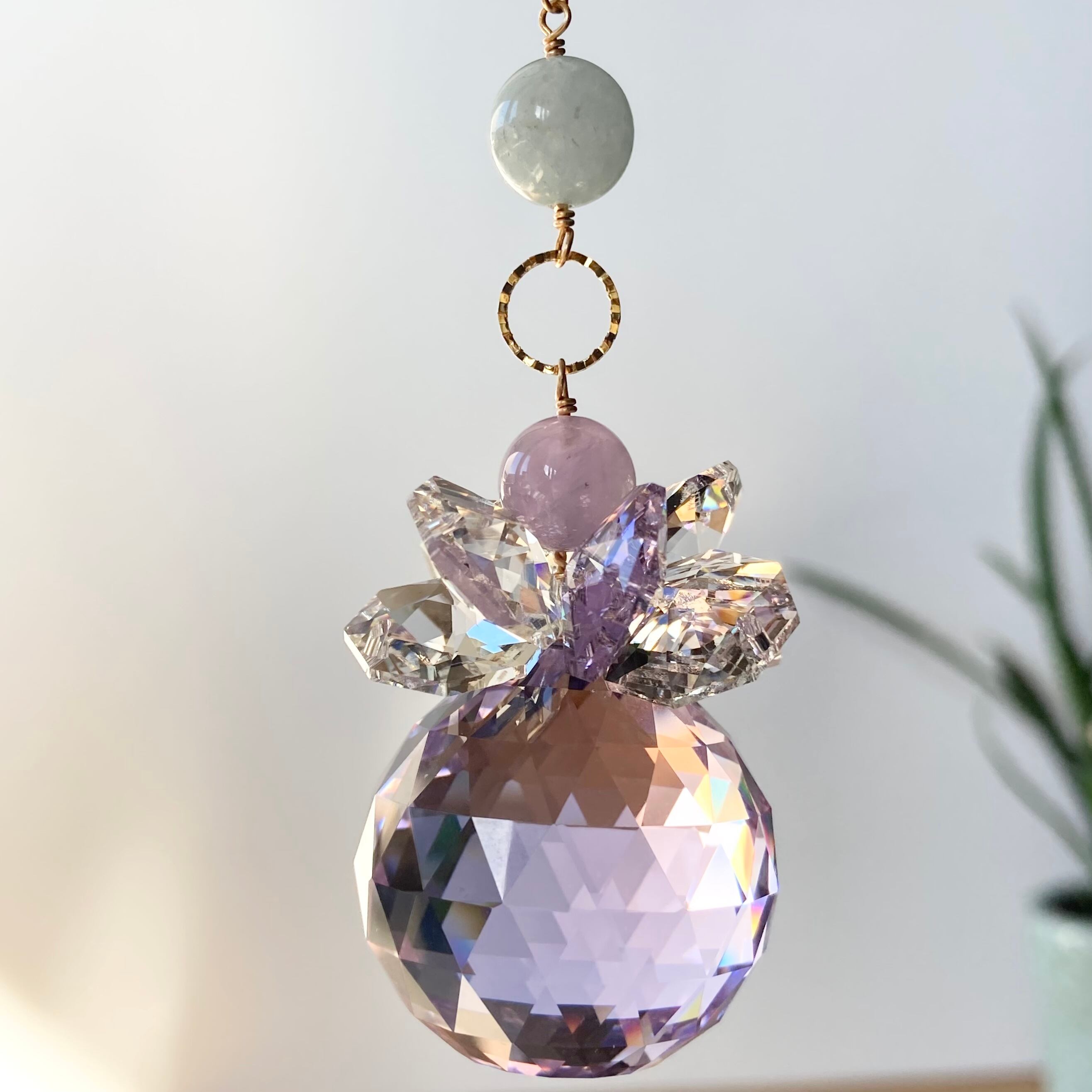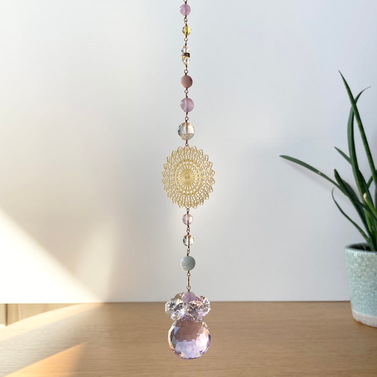 花のパーツ・ラベンダーアメジスト・アクアマリン・ファントムクォーツ・スギライト・シトリン・水晶とスワロフスキークリスタルガラスバイオレット3cmを繋いだサンキャッチャーです。