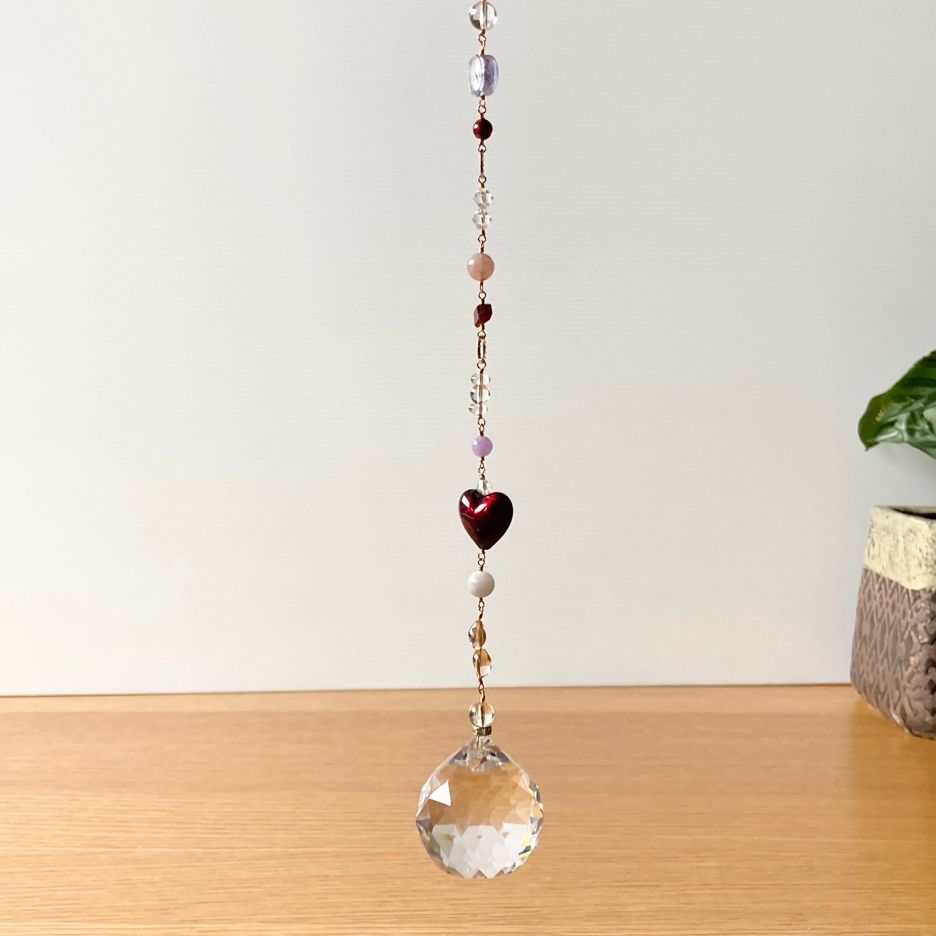 ガーネット・ムーンストーン・ストロベリークォーツ・アメジスト・水晶・ベネチアンビーズ・スワロフスキークリスタルとアスフォークリスタルガラス4cmを繋いだサンキャッチャーです。