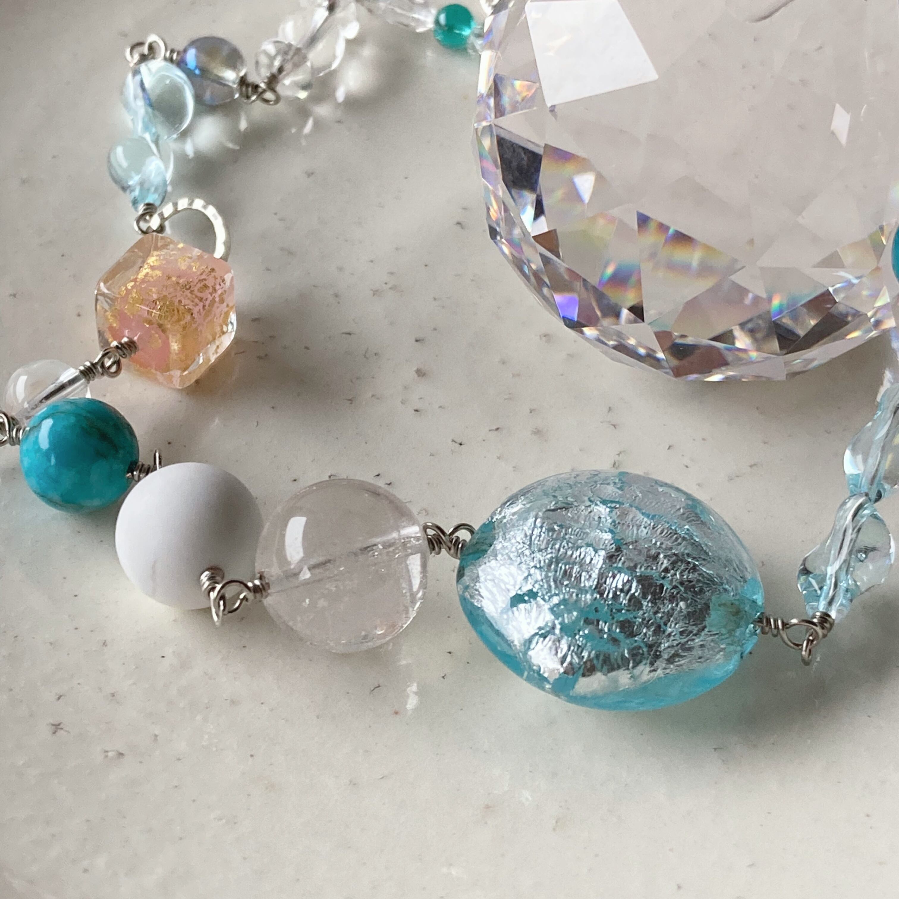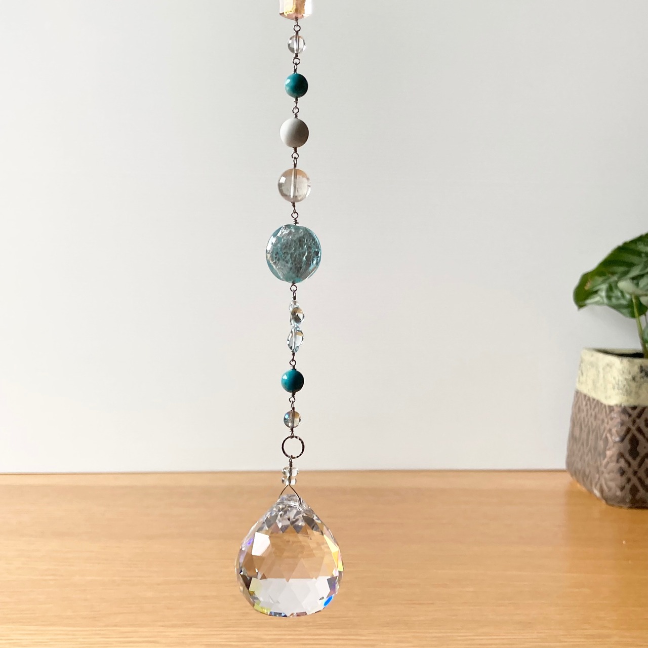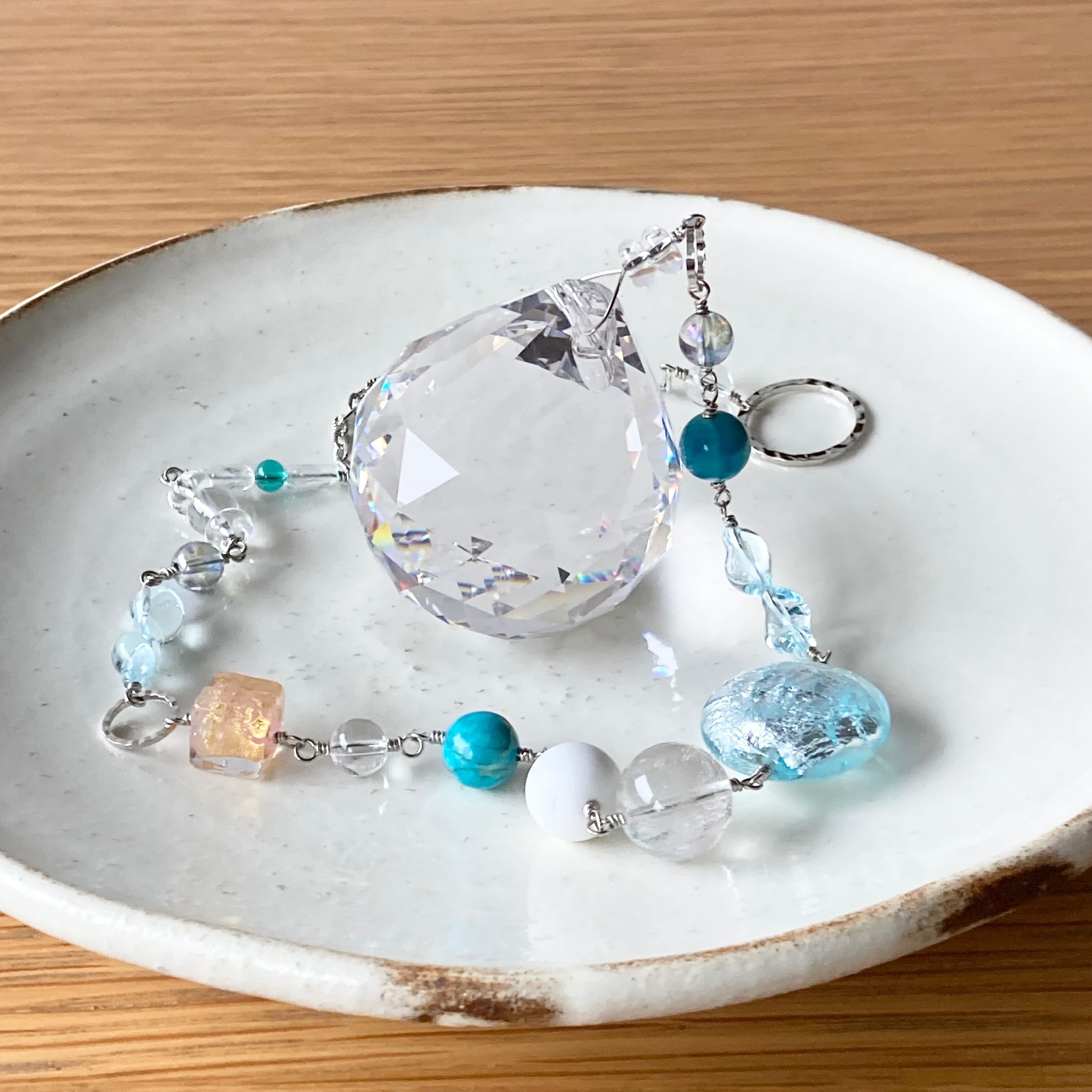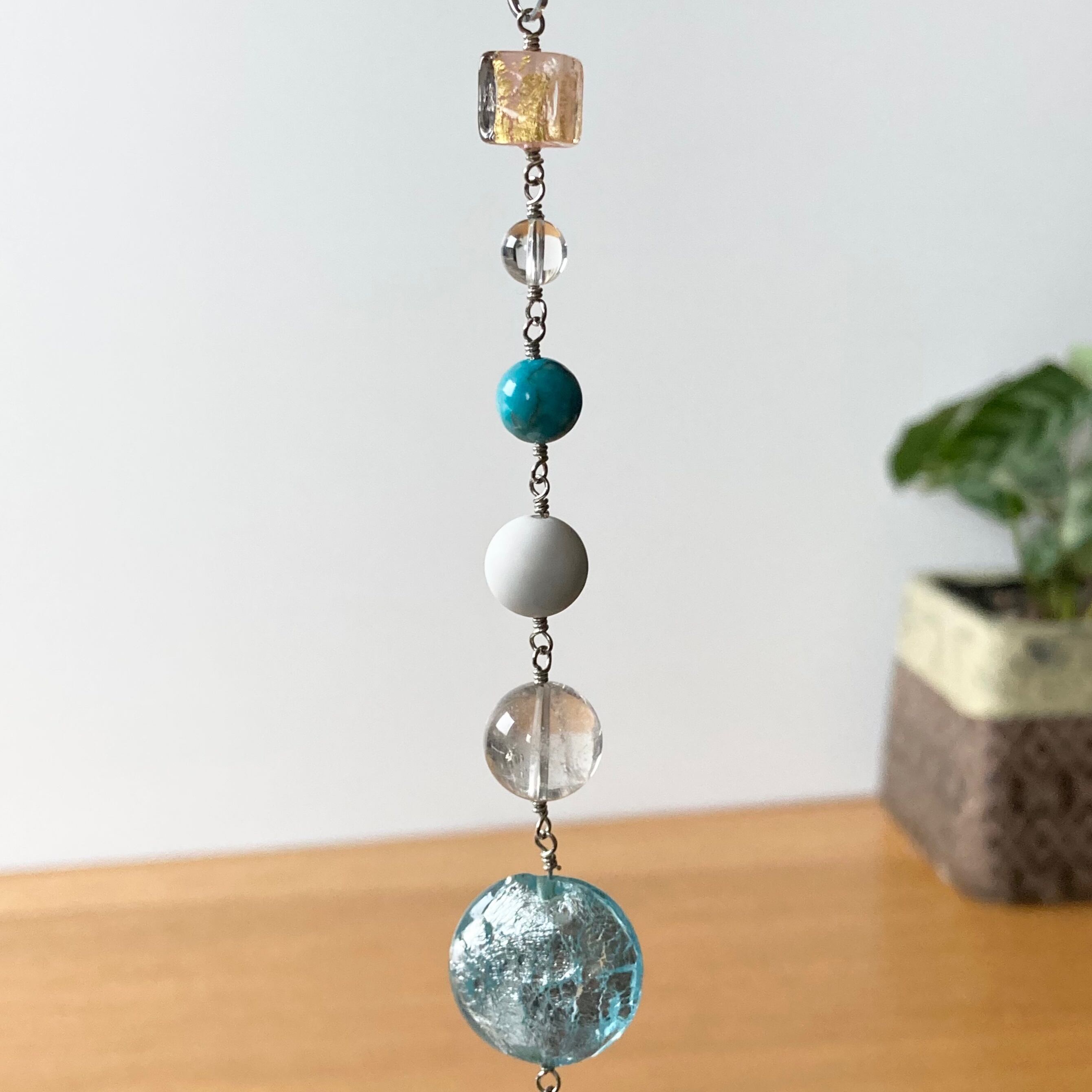 ベネチアンビーズの金色と水色のチェコビーズを基調に、ターコイズやファントムクォーツなどの天然石が美しく調和し、アスフォークリスタルガラスが太陽の光を受けてきらめくサンキャッチャーです。