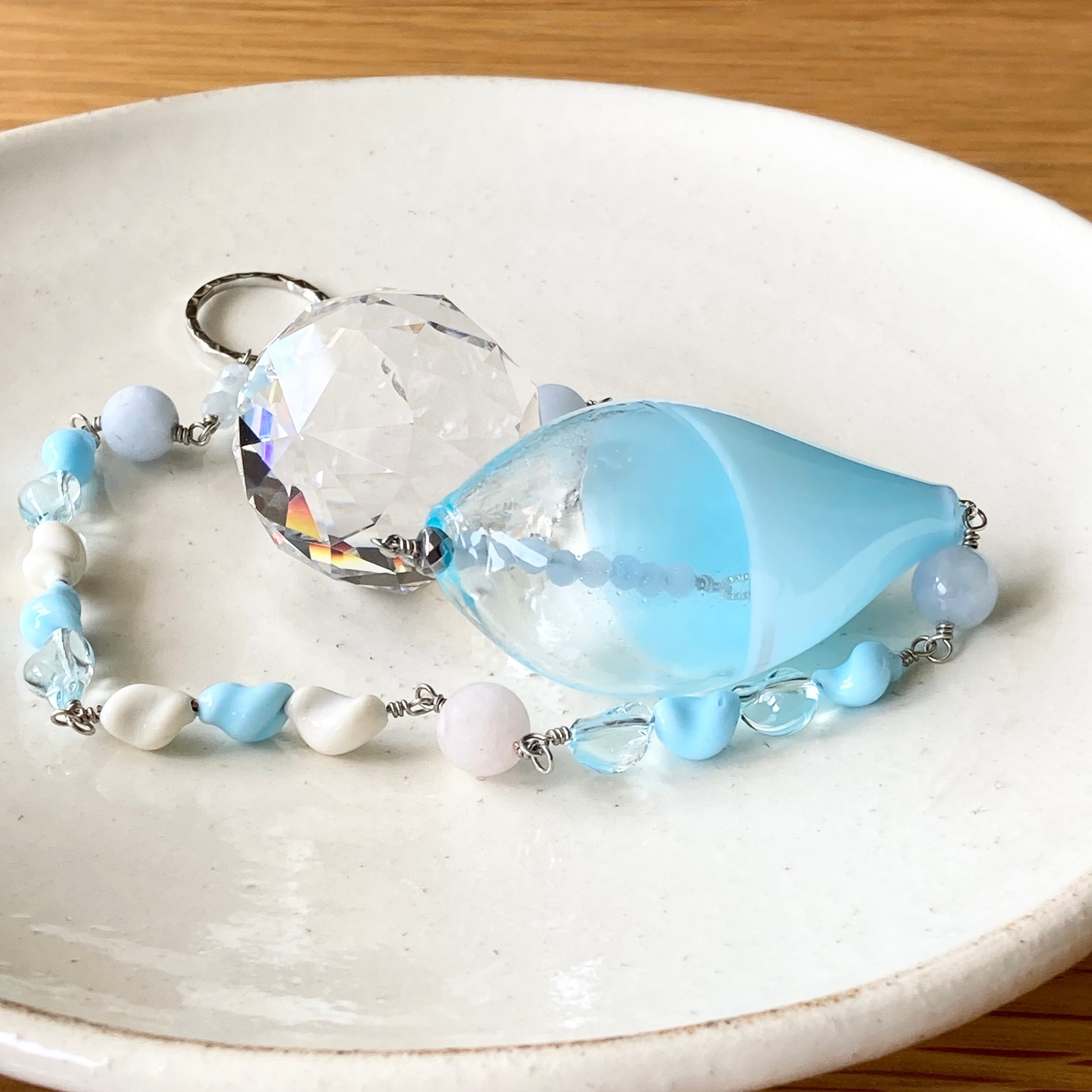 ふわふわとしたシズク型のベネチアンビーズは、見ているだけで心が軽やかになり、その中に繋がれた小さなアクアマリンは、まるで水が弾ける瞬間のような輝きを放ちます。水色と白色のベネチアンビーズと共に、プレシオサクリスタルガラスが光を受けてキラキラと輝き、部屋に虹色の光を散りばめまるサンキャッチャーです。