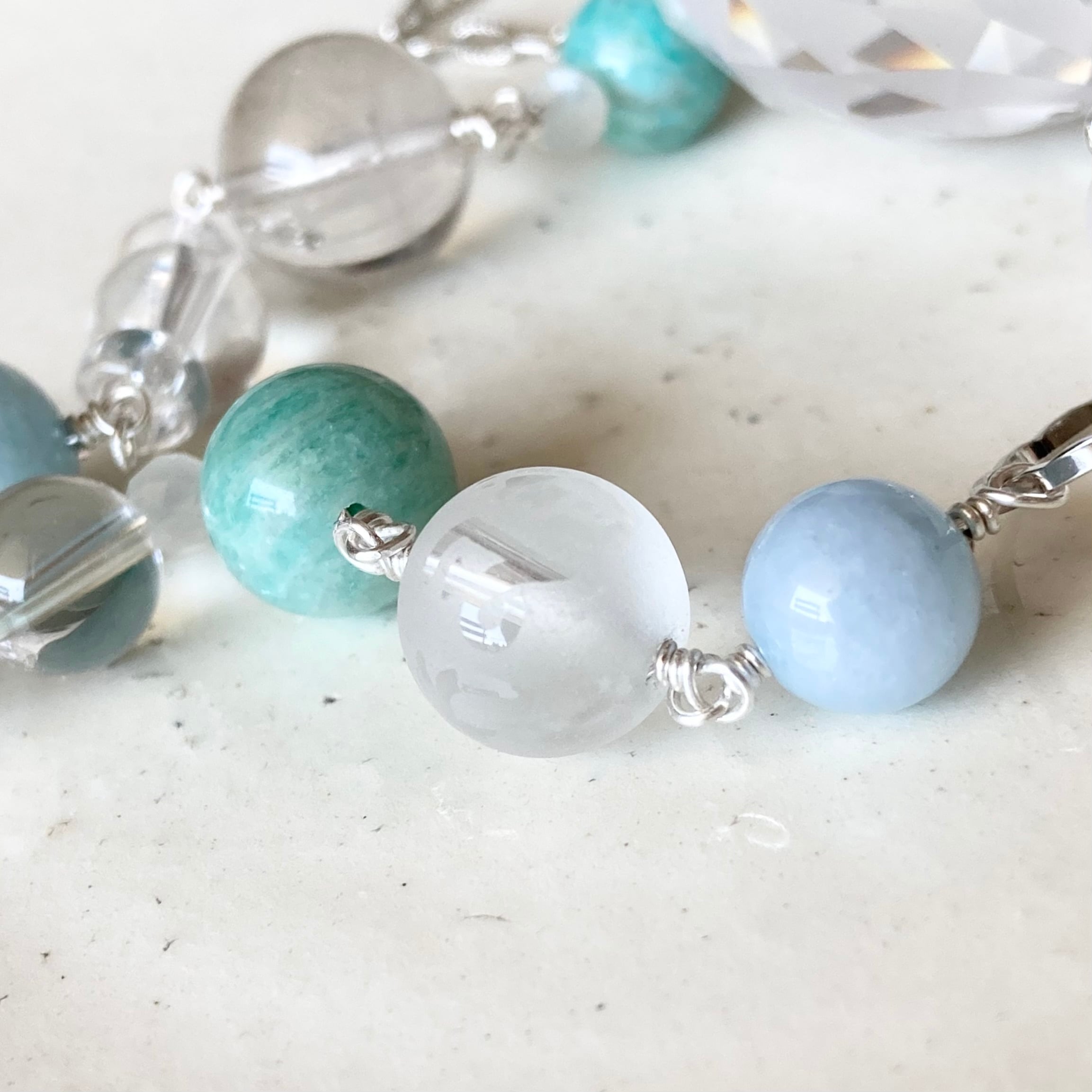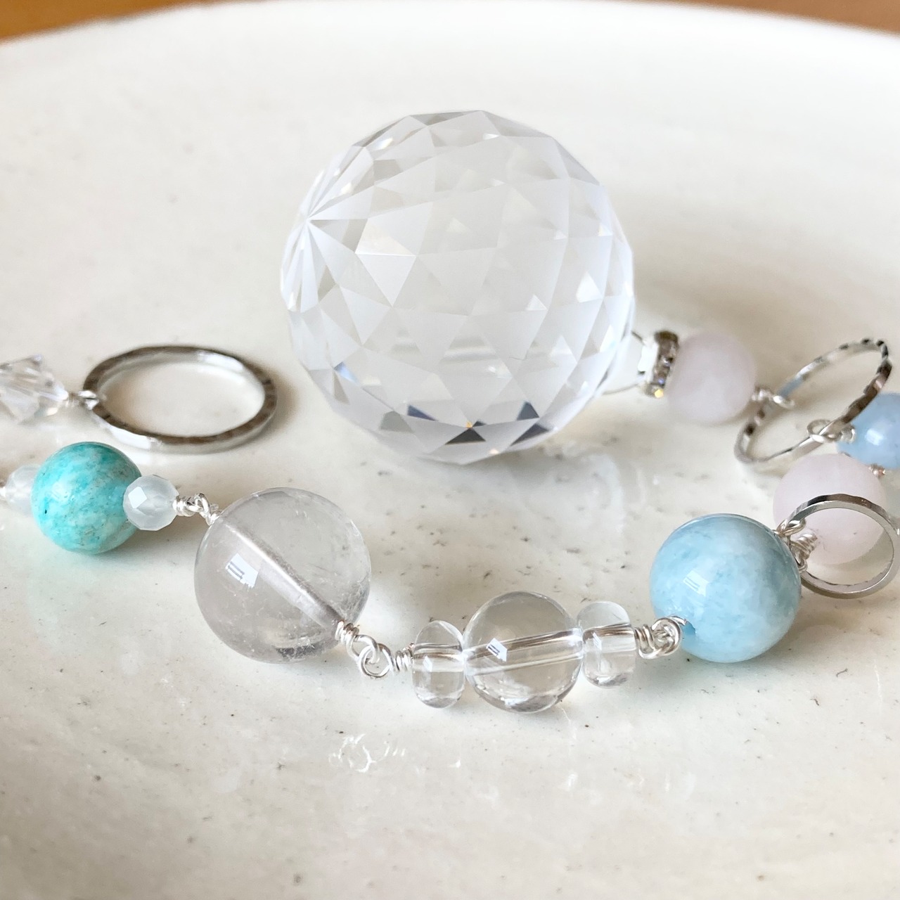 アクアマリンはエネルギーの循環を促し、アマゾナイトは希望をもたらします。モルガナイトは愛の象徴として心を穏やかにし、ファントムクォーツは困難を克服する力を引き出します。これらの石たちが一体となり、クリアでリフレッシュした空間を作り出します。