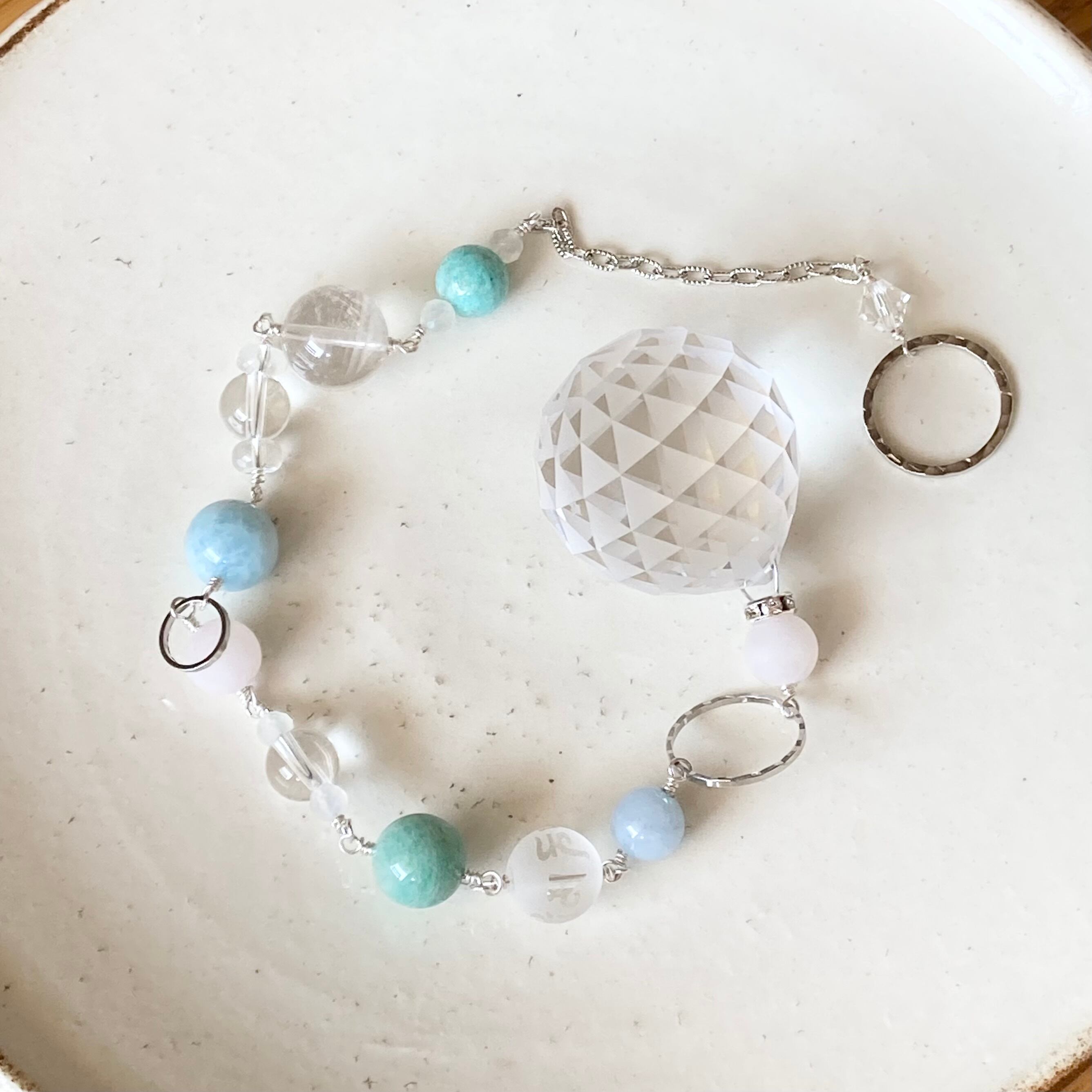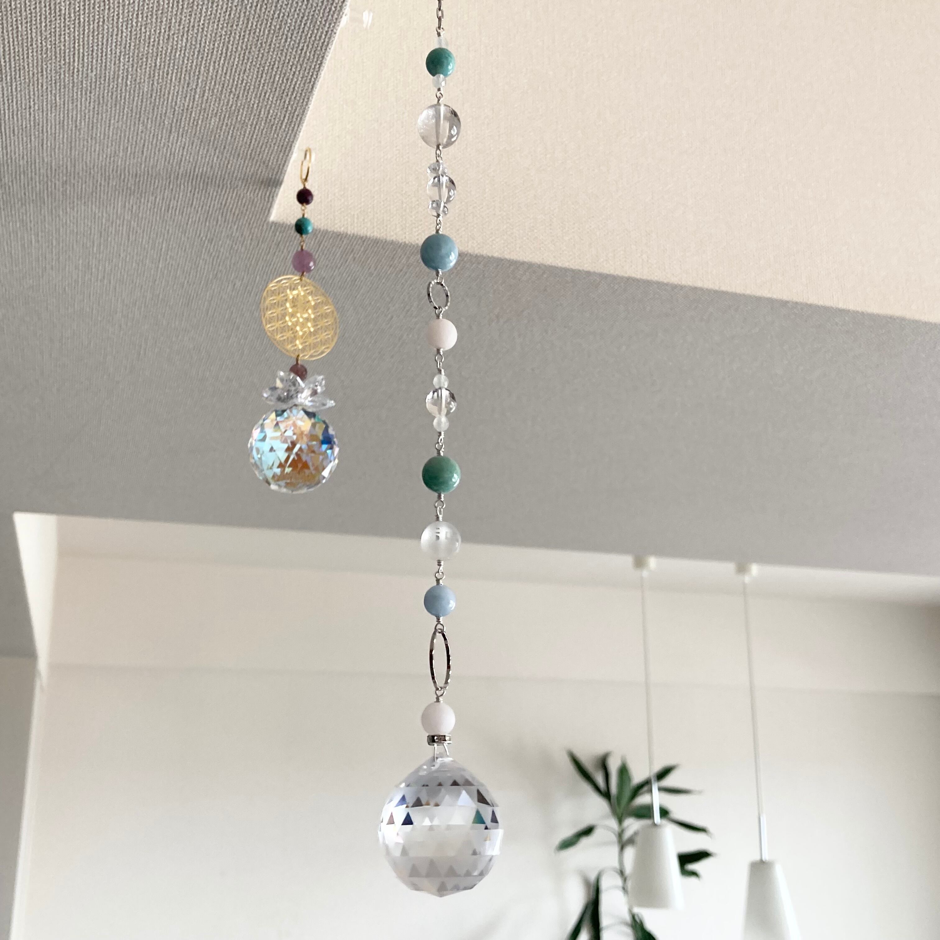 そして【オム・マニ・ペメ・フム】の刻印が施された水晶、スワロフスキークリスタルガラスのフロストを繋ぎ、雪の結晶のような幻想的な光を放ち、空間にクリアなエネルギーを広げるサンキャッチャーとなりました。