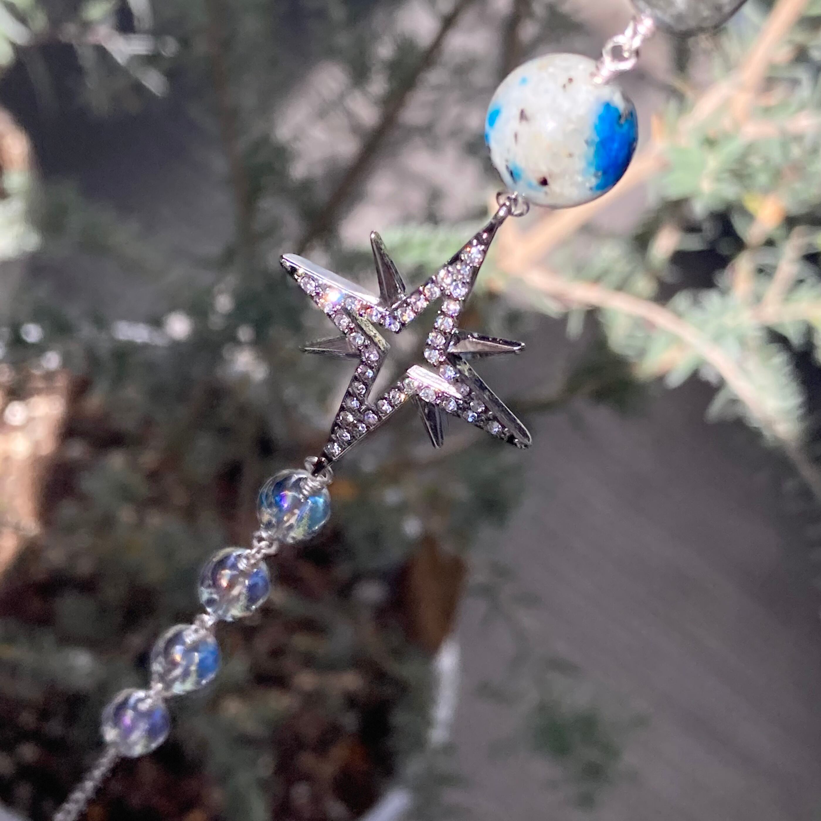 幸せのブルーを届けませんか?プレシオサクリスタルガラスのサファイア、オーロラブルーの魅力を放つオーラクォーツ、そして地球を感じさせるK2ブルー。それぞれが持つ特別なブルーのエネルギーが、心に安定と幸福感をもたらすサンキャッチャーです。