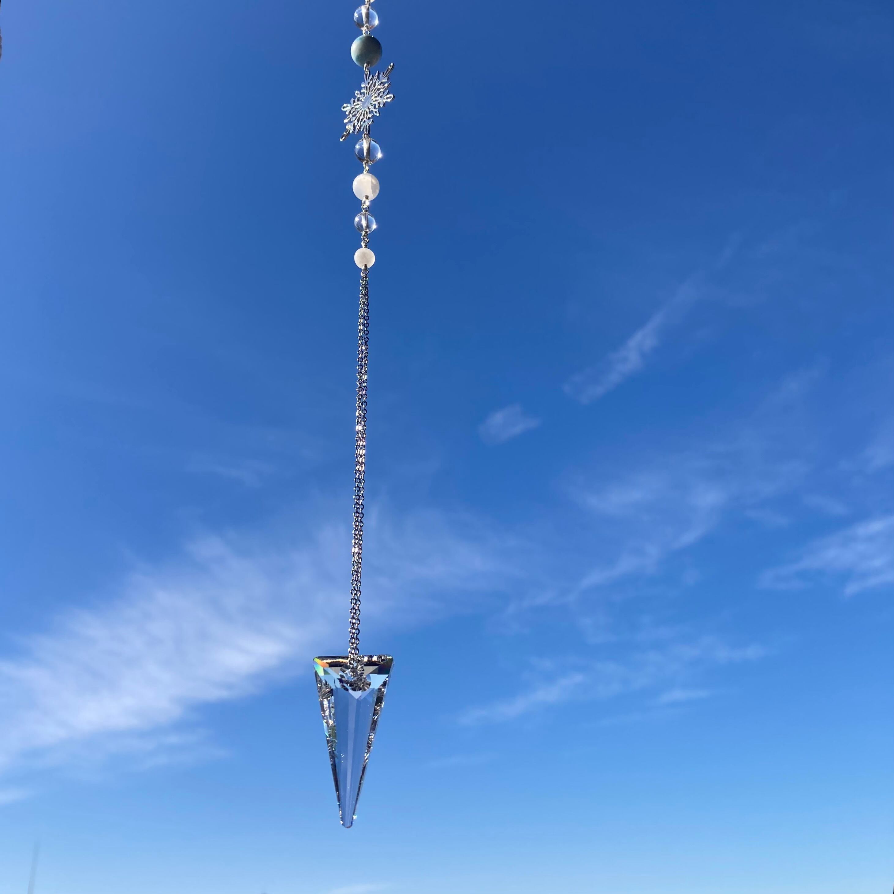 愛と浄化を広げる銀世界の輝きを♡ラリマー・カルサイト・ムーンストーン・水晶・雪の結晶スカシパーツとスワロフスキークリスタルガラス二等辺三角形3,9cmを繋いだサンキャッチャーです。