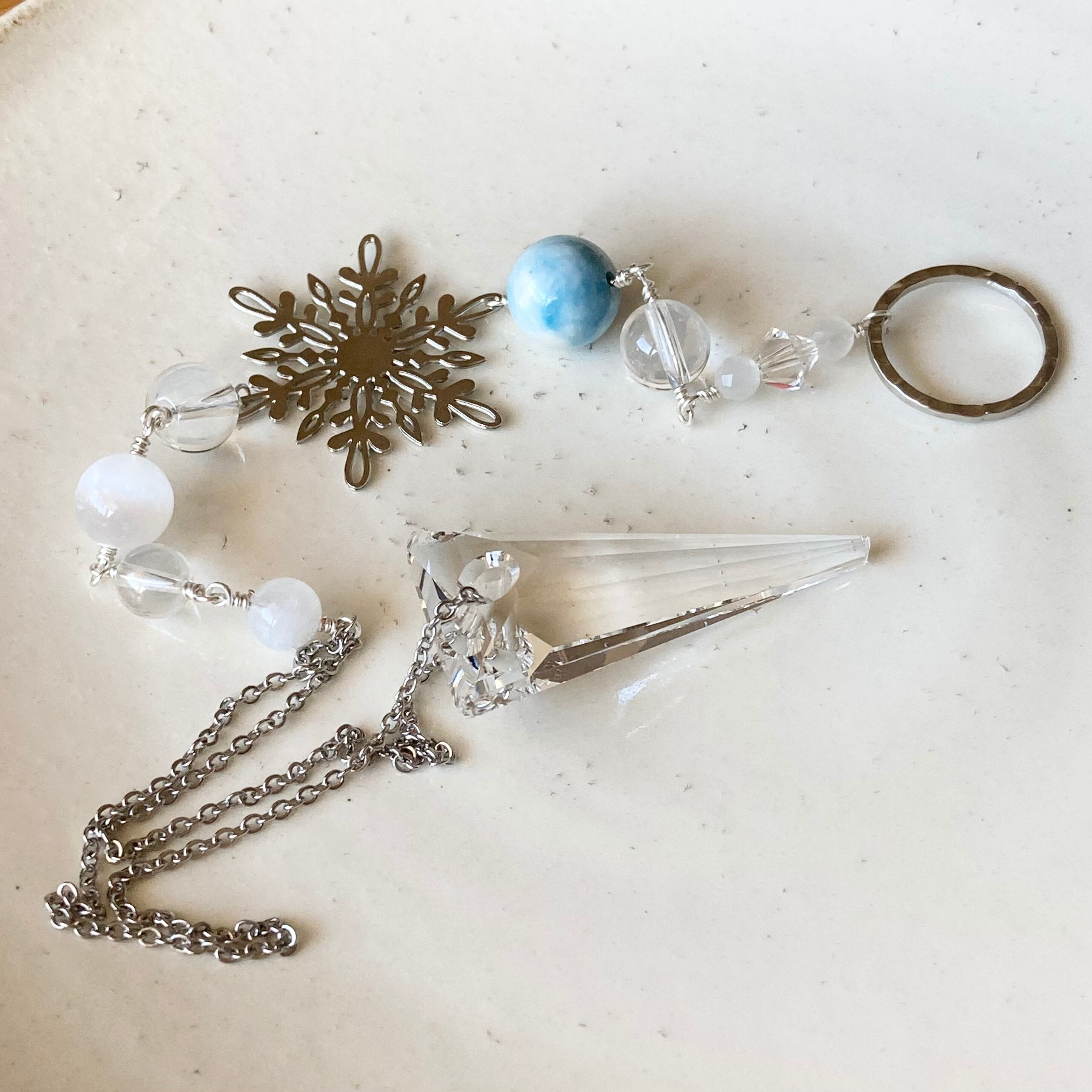 sold愛と浄化の銀世界の輝きを♡雪の結晶パーツ・ラリマー・ムーンストーン・カルサイトとスワロフスキークリスタルのサンキャッチャー