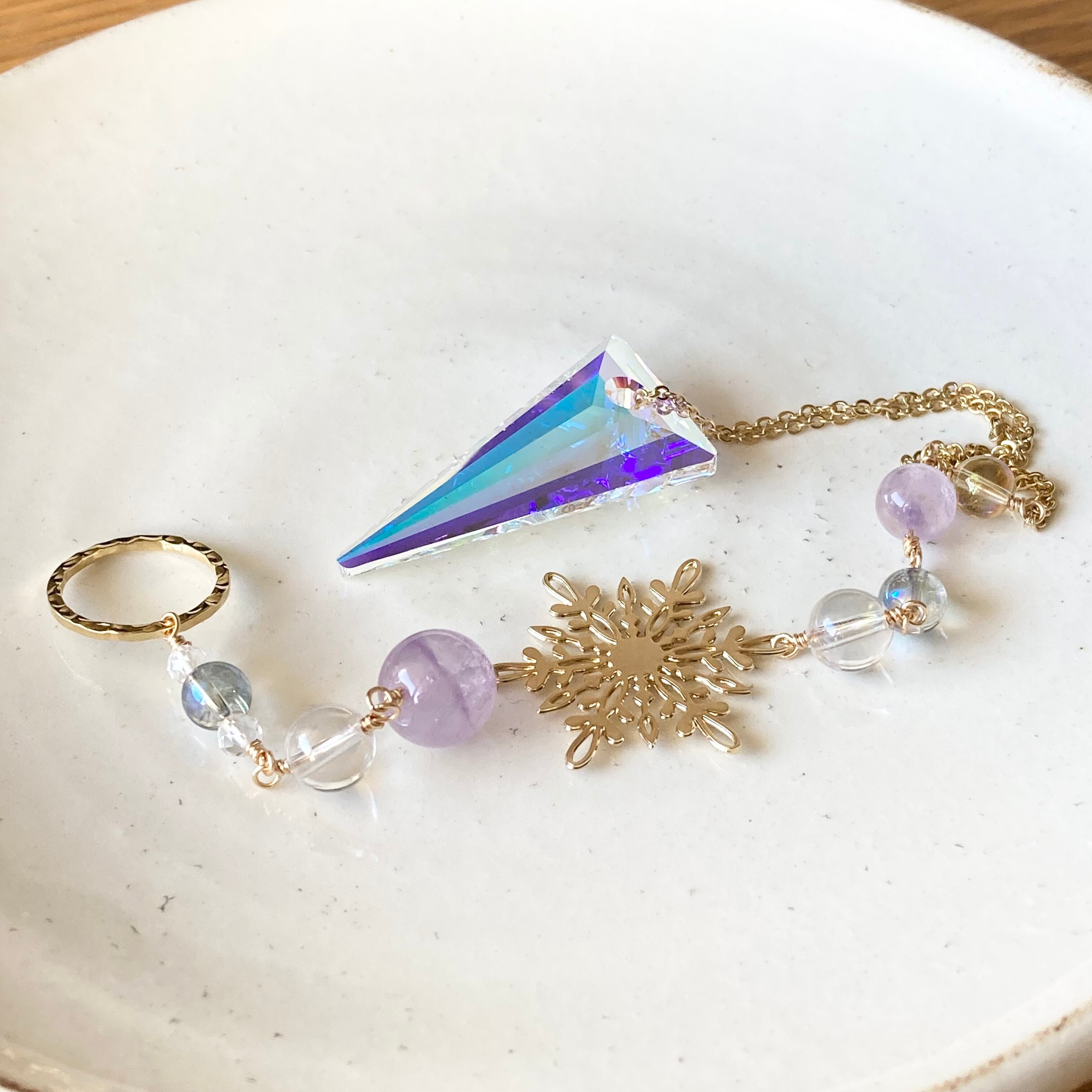 希望と喜びいっぱいに♡アメジスト・ブルーオーラクォーツ・シトリンオーラクォーツ・オーラクォーツ・水晶・雪の結晶スカシパーツとスワロフスキークリスタルガラス二等辺三角形3,9cmを繋いだサンキャッチャーです。