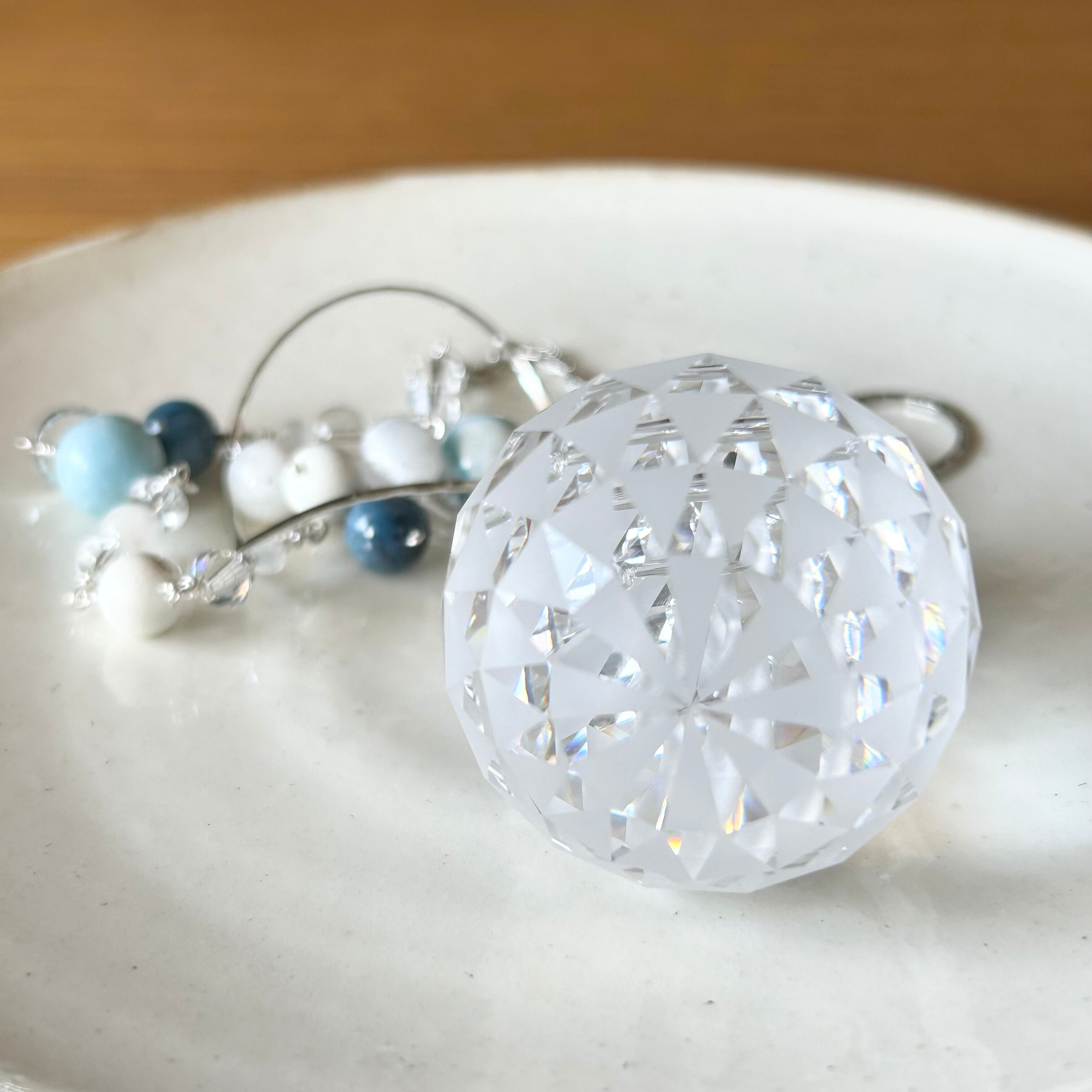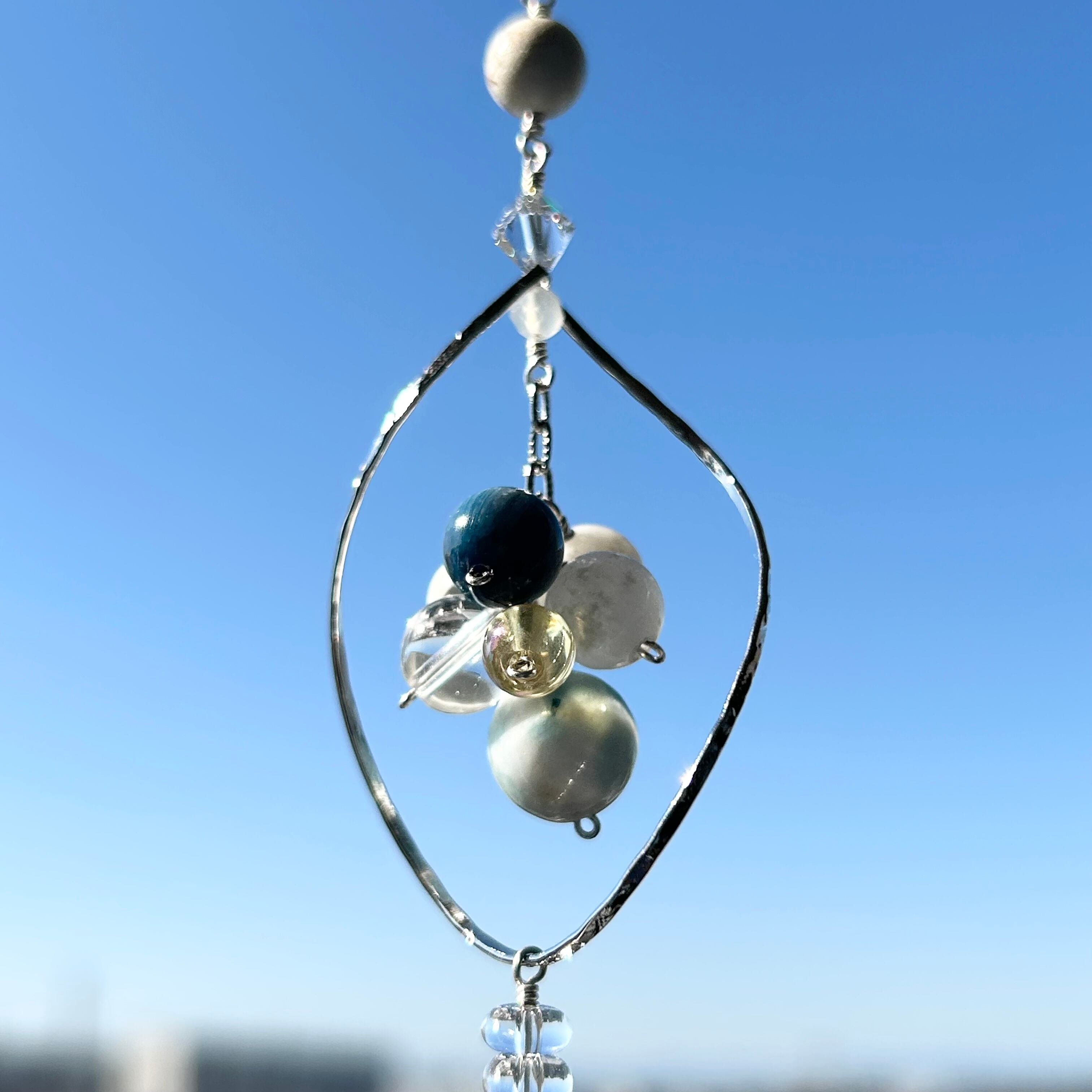 カイヤナイト、ラリマー、ムーンストーン、カルサイト、ハウライト、ヒマラヤ産レインボー水晶と、アスフォークリスタルガラスオクタゴンとスワロフスキークリスタルガラスを繋いだこのサンキャッチャーは、まさにエネルギーの宝庫であり、ツイストループパーツの中で揺れる8つの石たちが、エネルギーを動かし 固定概念を解放し、インスピレーションを高める役割を果たします。