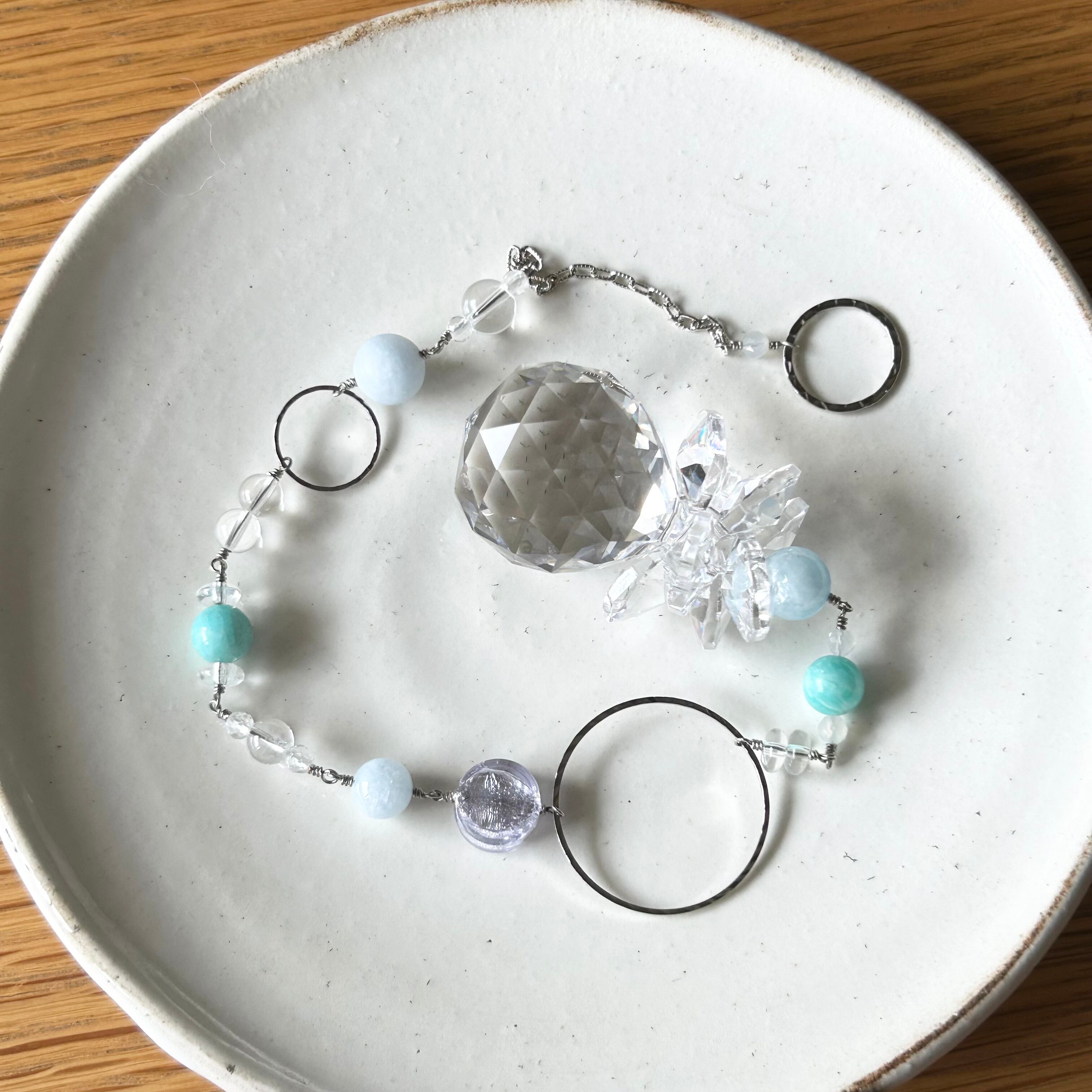 日常に幸せを呼び込むために、アクアマリン、アマゾナイト、水晶、ベネチアンビーズ、アスフォークリスタルガラス、プレシオサクリスタルガラスを巧みに組み合わせたサンキャッチャーが空間を優美に彩ります。窓辺に吊るすと、朝日の光を受けて部屋全体に美しい虹色の反射を生み出し、心に癒しと幸福を届けます。