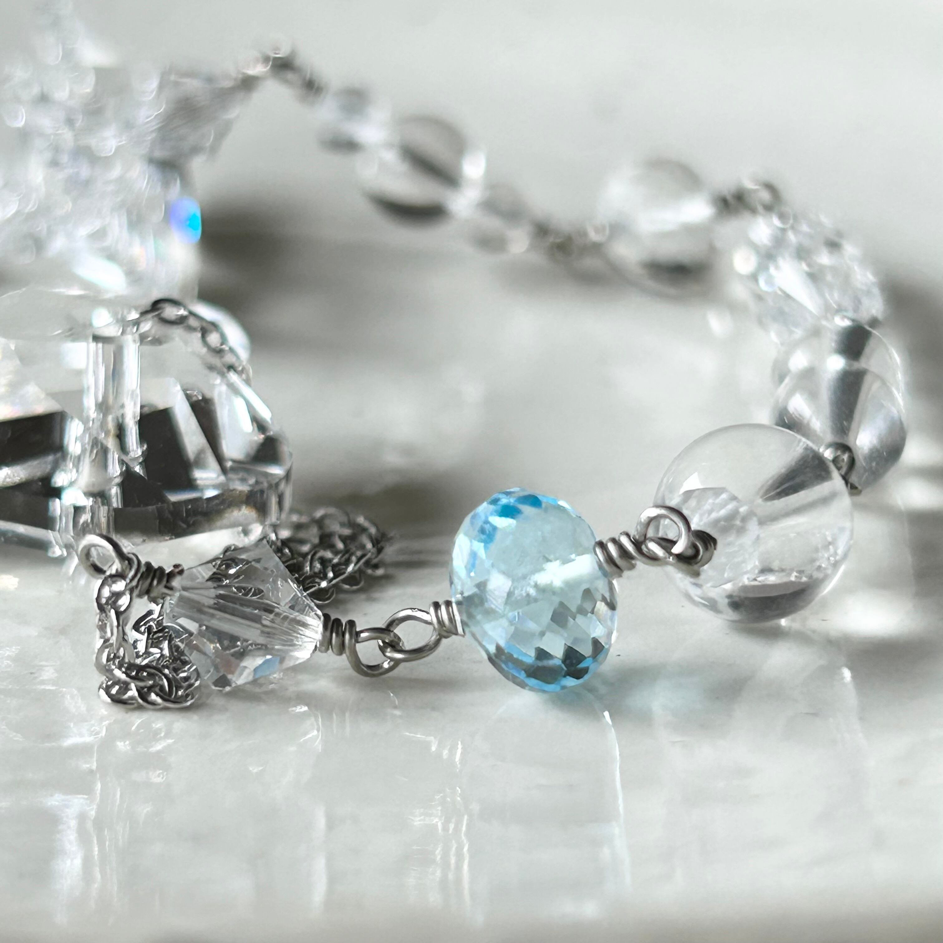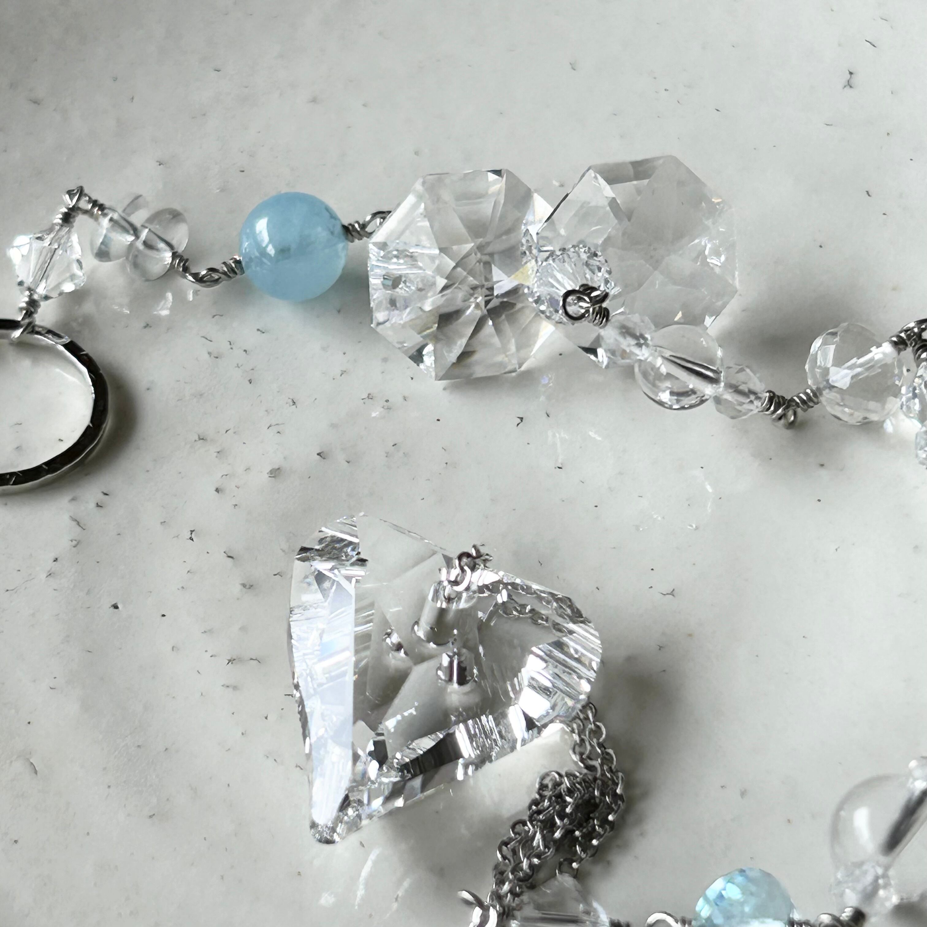 クリアなスワロフスキークリスタルガラスハート型2,8cmと水晶、幸せのブルーのブルートパーズ、アクアマリンを繋いだサンキャッチャーです。