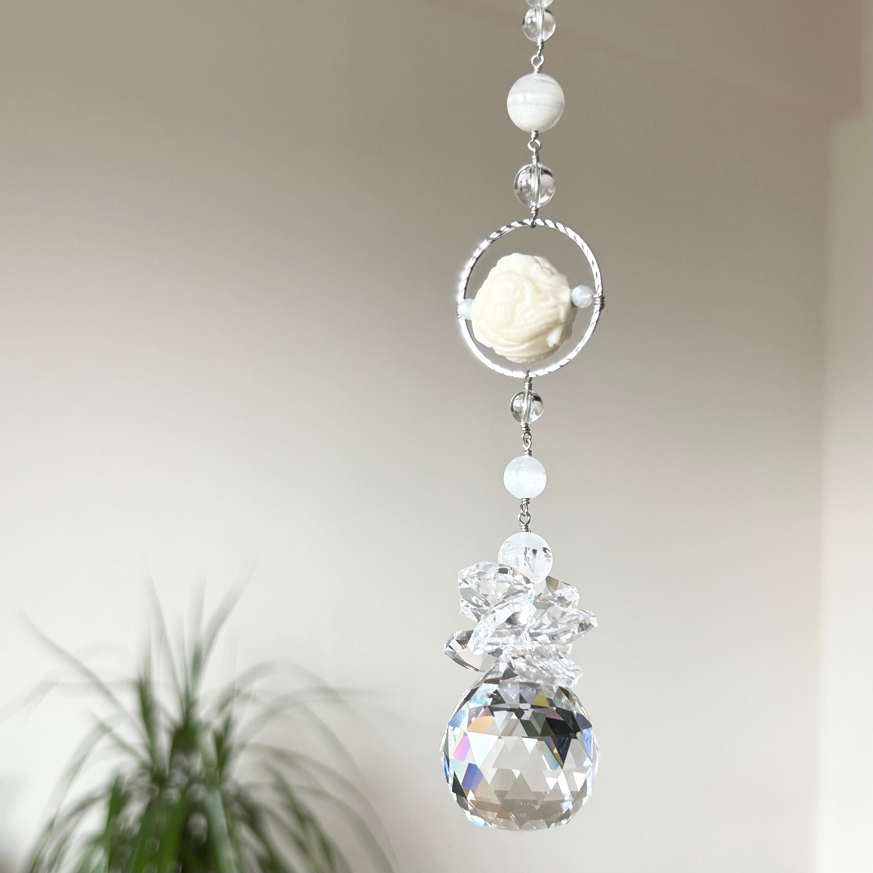 最強浄化で整える♡天然菩提樹 【龍】とファントムクォーツ、カルサイト、水晶とプレシオサクリスタルガラス3cmを繋いだサンキャッチャーです。